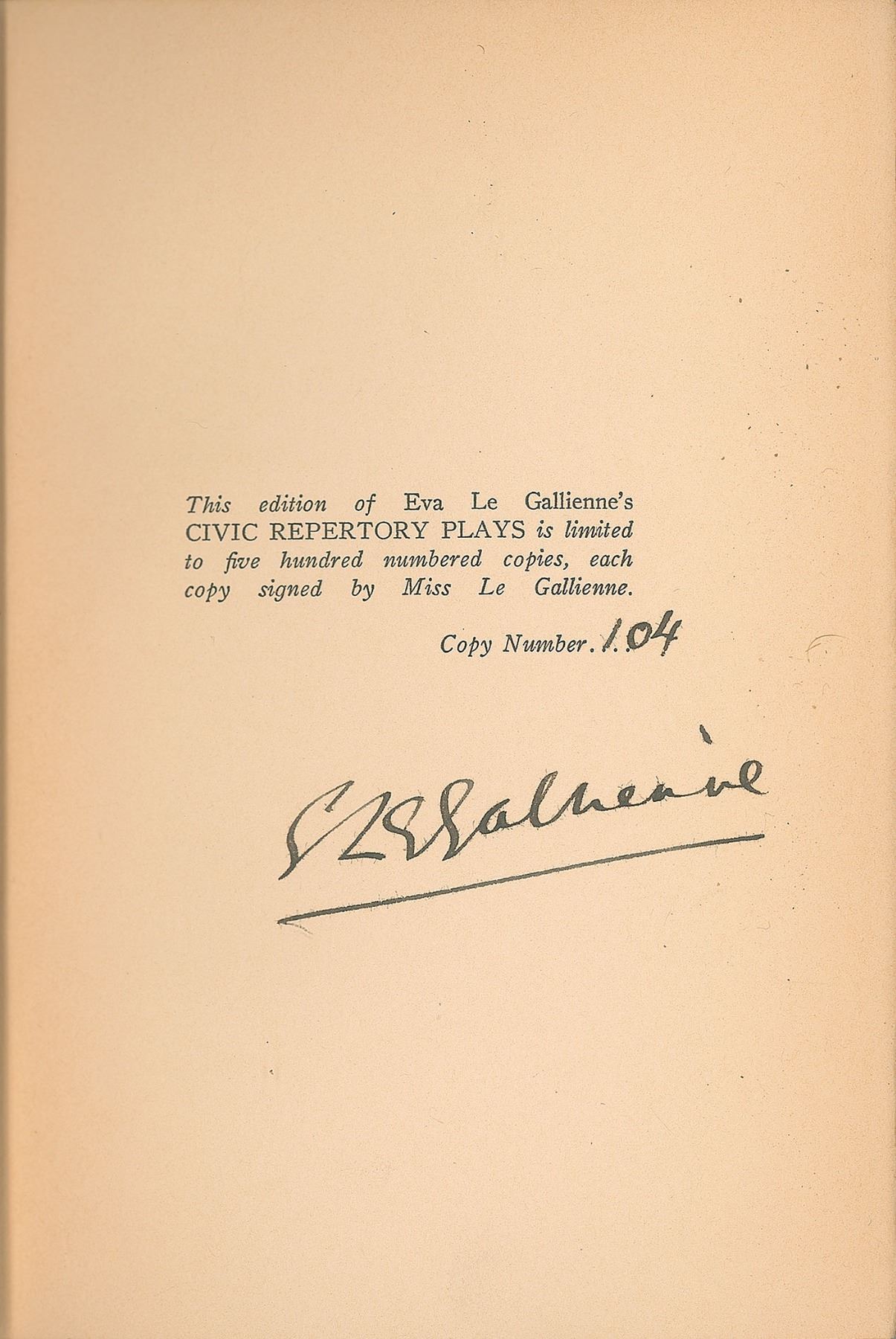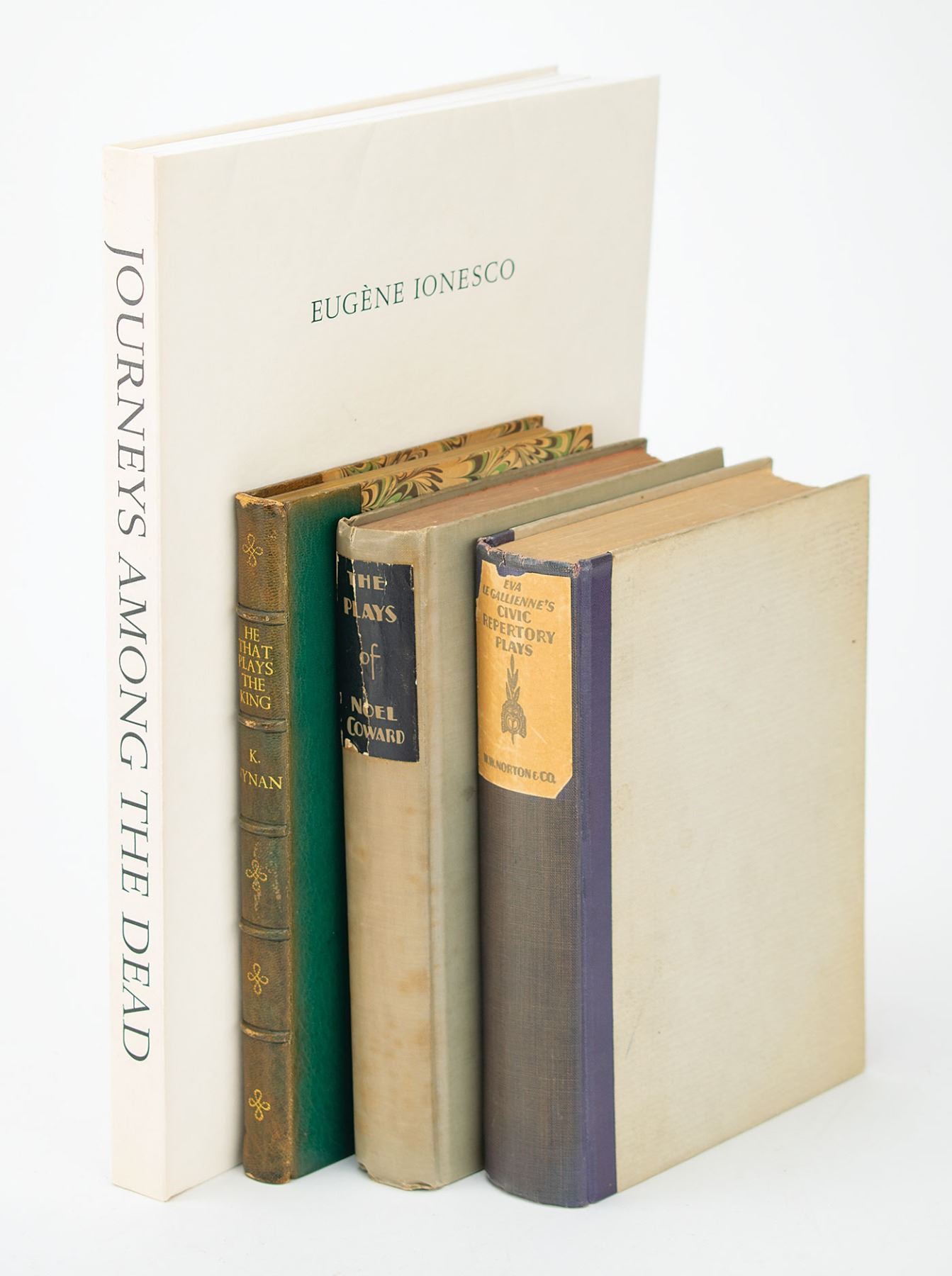 Four books associated with drama, including: an oversized slipcased limited edition of Journeys Among the Dead published by the Limited Editions, numbered 601/1000, signed on the colophon in pencil by Eugene Ionsesco, "E. Ionesco"; a hardcover first edition of The Plays of Noel Coward, signed and inscribed in fountain pen on the first free end page, "For Bill, from Noel 1929"; a hardcover limited edition of Eva Le Gallienne's Civic Repertory Plays, numbered 104/500, signed on the colophon in fountain pen, "E. Le Gallienne"; and a quarter morocco hardcover limited deluxe edition of He That Plays the King by Kenneth Tynan, numbered 39/50, signed on the colophon in fountain pen by noted critic, "Kenneth Tynan." In overall very good to fine condition.
