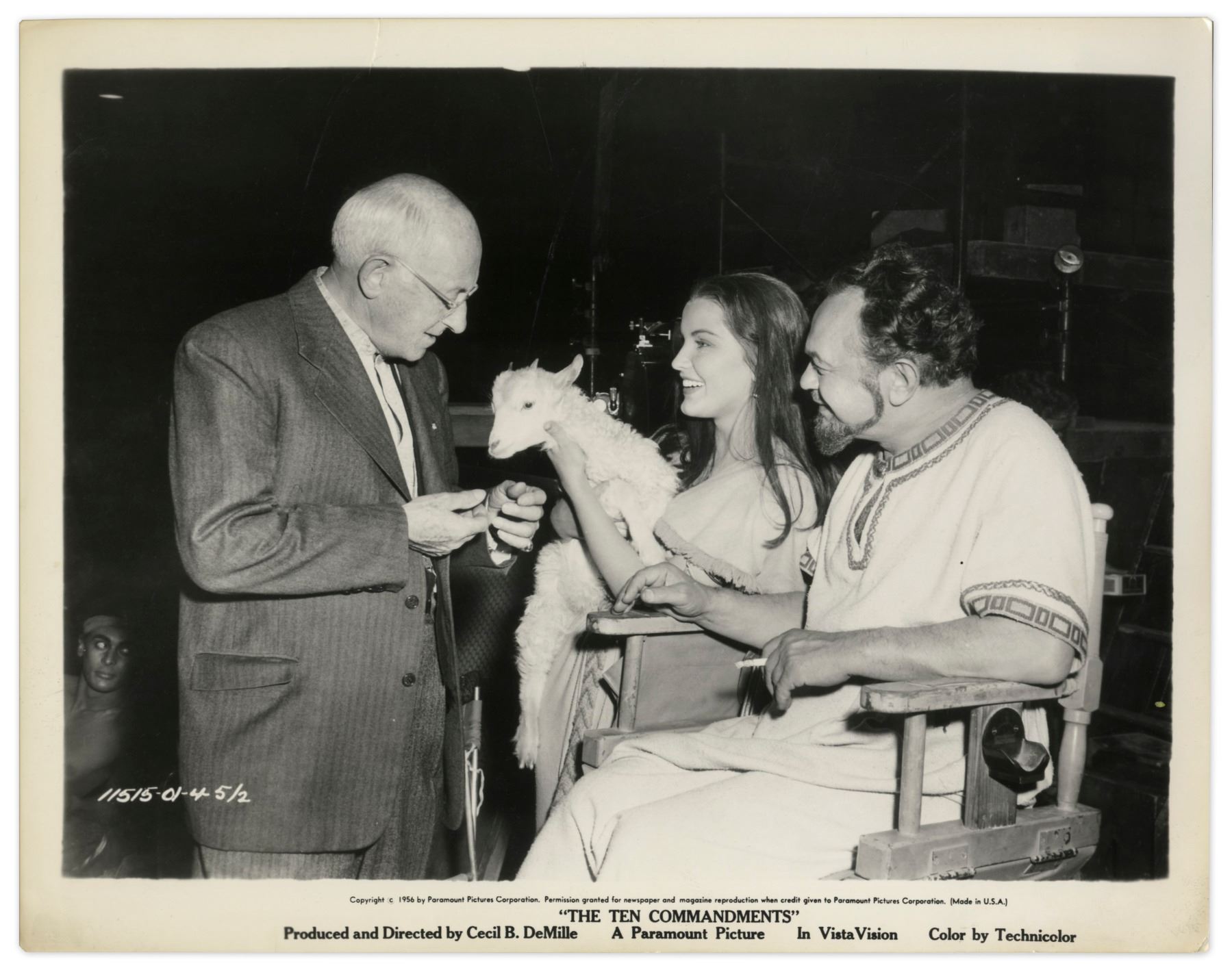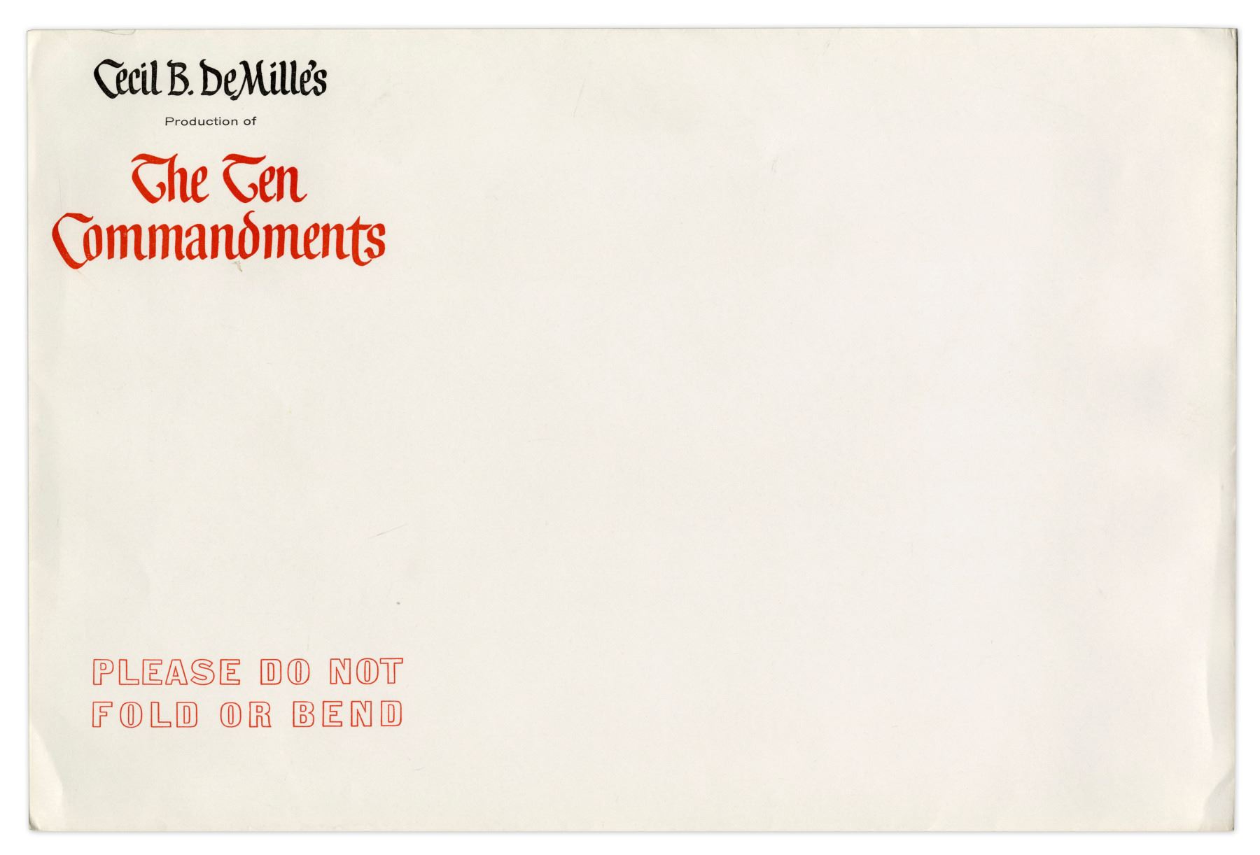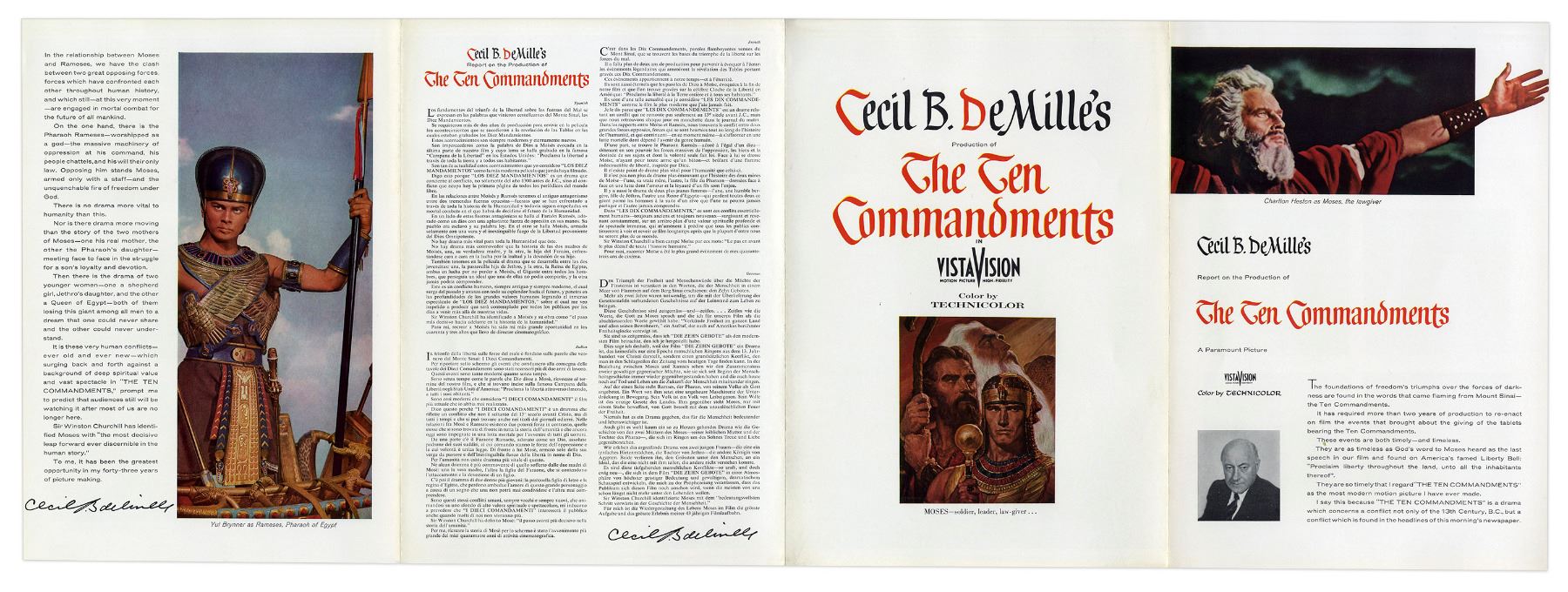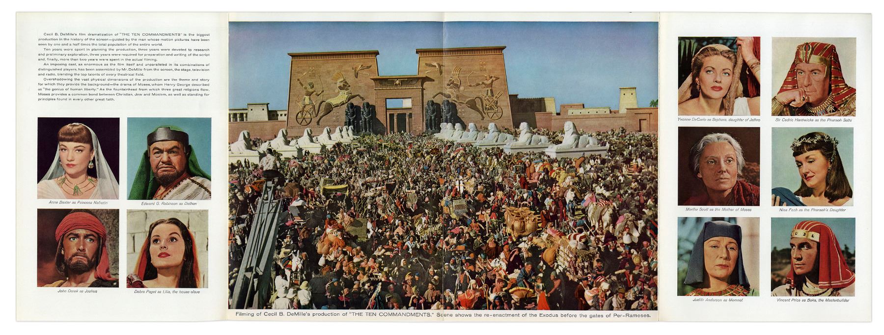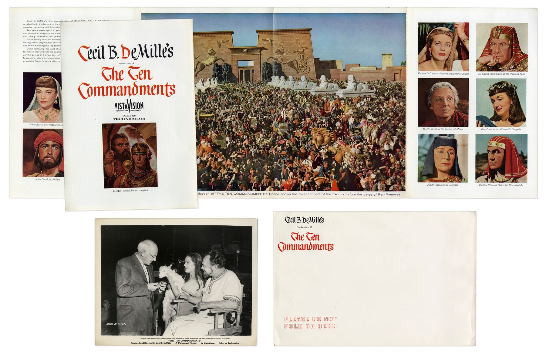 Original brochure for Cecil B. Demille's 1956 epic film, ''The Ten Commandments''. Full color brochure contains 2-page centerfold, actor photos and write-up by Demille. 8 pages, measures 8'' x 12''. Comes with original mailing envelope and production still. All items in near fine condition.