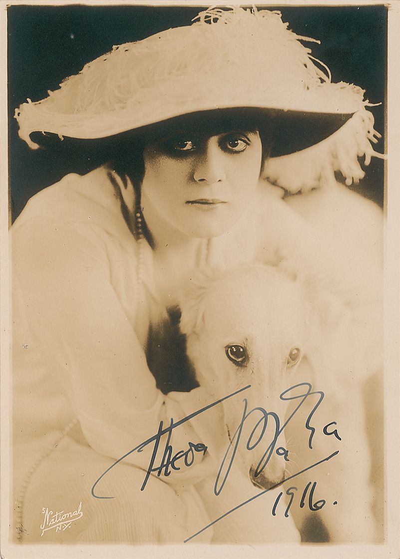 Vintage matte-finish 5 x 7 photo of Bara snuggling with a canine pal, signed in fountain pen, “Theda Bara 1916.” In fine condition, with some scattered light silvering.