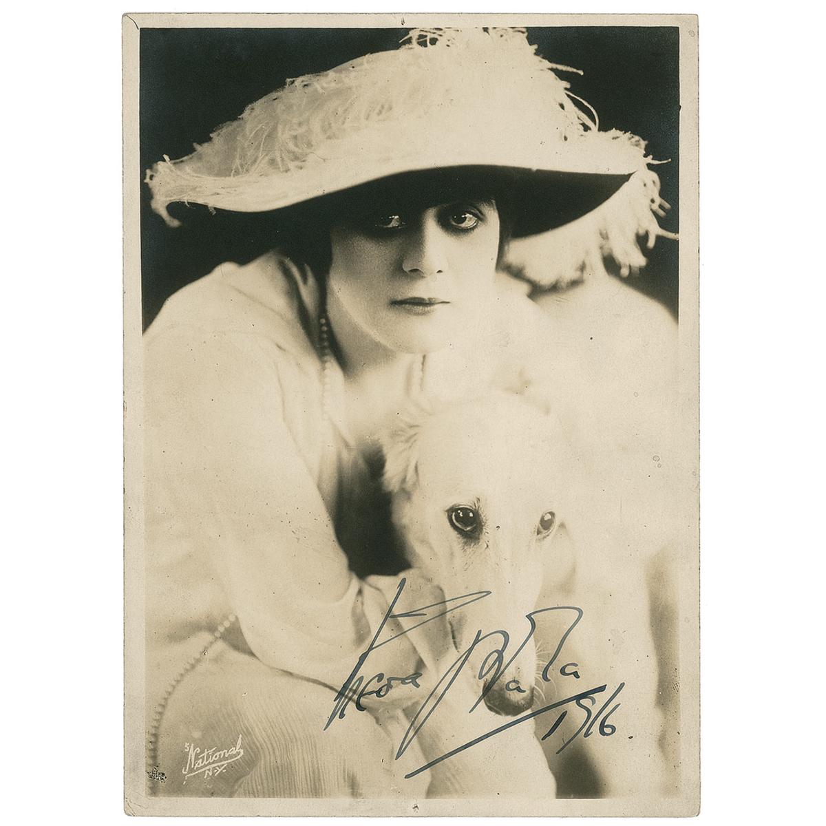 Ohio-born yet strangely exotic film actress (1885–1955), nicknamed “The Vamp,” who became one of the most iconic sex symbols of the silent era. Vintage matte-finish 5 x 7 photo of Bara and her dog, signed in fountain pen, “Theda Bara, 1916.” In fine condition, with two pinholes at the extreme top and bottom borders, a touch of subtle soiling, and some silvering to the darker areas.