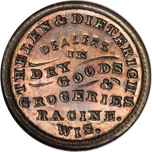<B>Thelen & Dieterich Grocers, Racine, WI, MS66 Red and Brown NGC.</B></I> Fuld-700J-2a, R.7. The obverse is 50% red, the reverse is 20% red. Evenly struck and unabraded. Struck from a rusted OUR CARD patriotic die, which gives that side a granular appearance. Thelen & Dieterich were among the many dry goods and grocery merchants who issued store cards during the Civil War.<BR><BR><b>Shipping:</b> Coins & Currency (<a target="_blank" href="http://www.heritageauctions.com/common/shipping.php">view shipping information</a>)