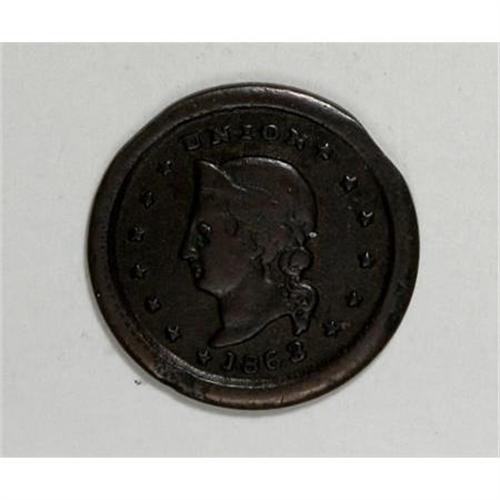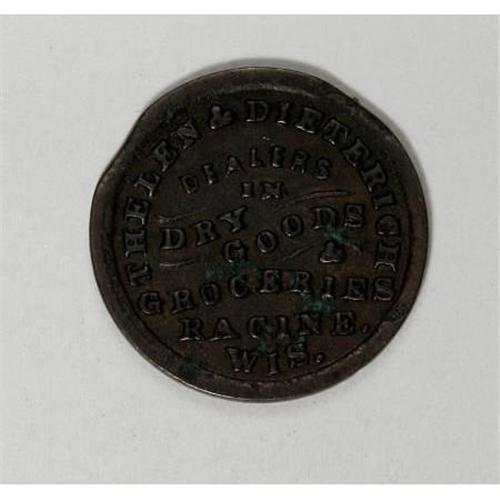 <B>Thelen & Dieterich, Racine, WI, R.7 Civil War Merchant Token.</B></I> Fuld-WI700J-1a, R.7. Uncertified Civil War merchant token with two rim clips and some green spots on the reverse. A very scarce Wisconsin piece.<BR><BR><b>Shipping:</b> Coins & Currency (<a target="_blank" href="http://www.heritageauctions.com/common/shipping.php">view shipping information</a>)