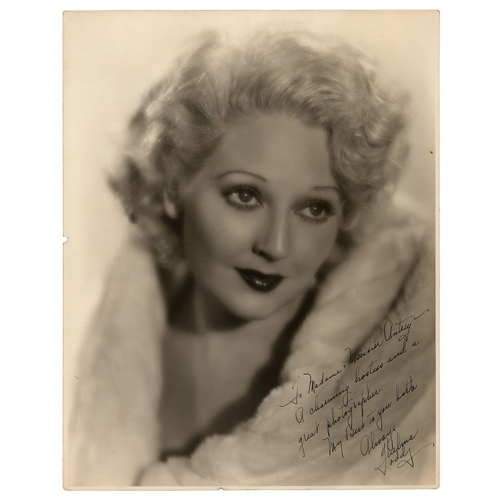 American actress (1906"“1935) best remembered for her appearances in such comedy classics as Monkey Business, Horse Feathers, and Another Fine Mess, who mysteriously died from carbon monoxide poisoning. Glamorous vintage matte-finish 10.75 x 13.75 close-up portrait of the gorgeous blonde draped in fur, nicely signed and inscribed in fountain pen, "To Madame & Monsieur Autry"”A charming hostess and a great photographer. My best to you both, Always, Thelma Todd." In fine condition, with two tiny edge chips.