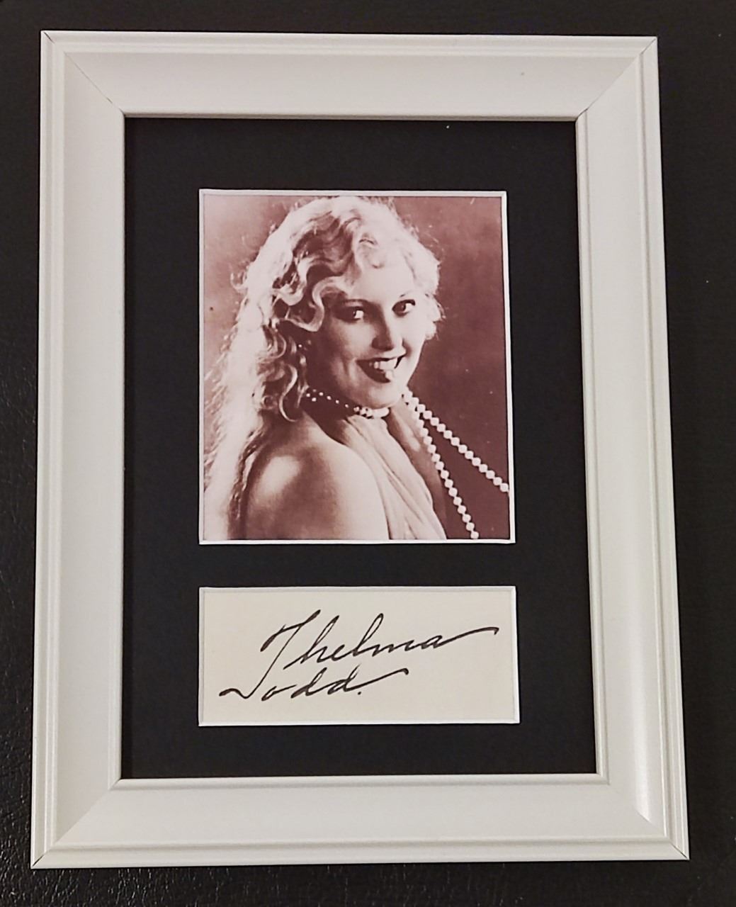 Thelma Alice Todd (July 29, 1906 – December 16, 1935) was an American actress often referred to by the nickname "The Ice Cream Blonde". Appearing in around 120 feature films and shorts between 1926 and 1935, she is best remembered for her comedic roles in films such as Marx Brothers' Monkey Business and Horse Feathers and a number of Charley Chase's short comedies. She co-starred with Buster Keaton and Jimmy Durante in Speak Easily. She also had roles in several Wheeler and Woolsey and Laurel and Hardy films, the last of which (The Bohemian Girl) featured her in a part that was truncated by her suspicious death in 1935 at the age of 29. Her autograph is mounted and framed. Supplied with coa.