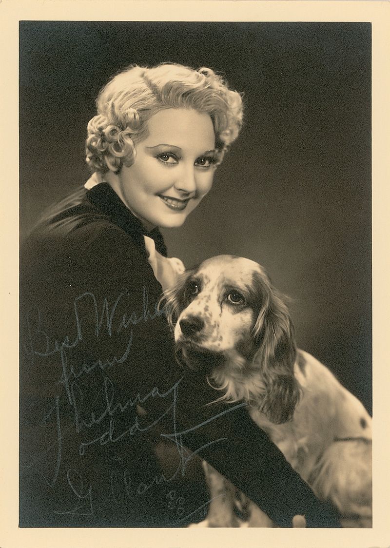 Desirable vintage matte-finish 5 x 7 photo of Todd and her dog, signed in white artist’s pencil “Best wishes, from Thelma Todd & Gallant,” adding a small sketch of a dog’s paw print below the signature. In fine condition, with some silvering to dark areas of photo and a couple trivial dings to corner tips.