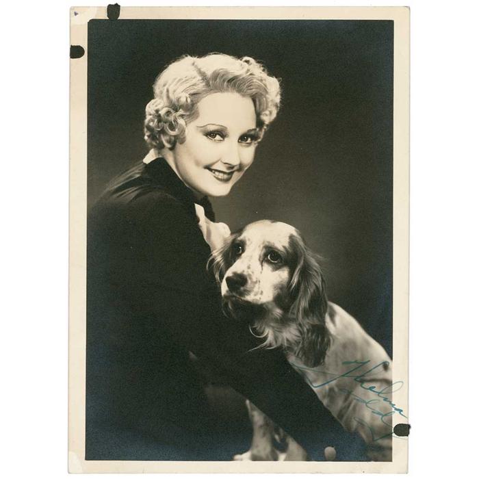 American actress (1905–1935) best remembered for her appearances in such comedy classics as Monkey Business, Horse Feathers, and Another Fine Mess. Though her death from carbon monoxide poisoning at the age of 30 was ruled an accident, suspicious circumstances led to a number of theories of varying plausibility, including speculation that she was the victim of a “hit” ordered by gangster “Lucky” Luciano. Vintage matte-finish 5 x 7 photo of Todd with a cocker spaniel, signed in fountain pen. The reverse bears the typewritten date October 11, 1935. A touch of subtle silvering to dark portions, small spot of marginal skinning to one corner, and small marginal adhesive tab remnants (one just touching last name of signature), otherwise fine condition. Pre-certified PSA/DNA and RRAuction COA.