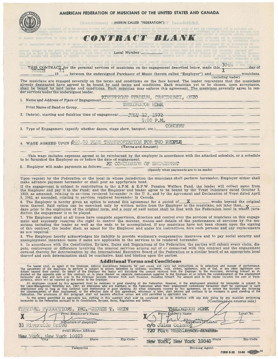 DS, one page, 8.5 x 11, March 30, 1972. Agreement for Monk to perform at Riverfront Stadium in Cincinnati, Ohio, on July 22, 1972, for $900. Signed at the conclusion in black ballpoint by Thelonious Monk and countersigned by legendary jazz concert promoter George Wein. In fine condition.