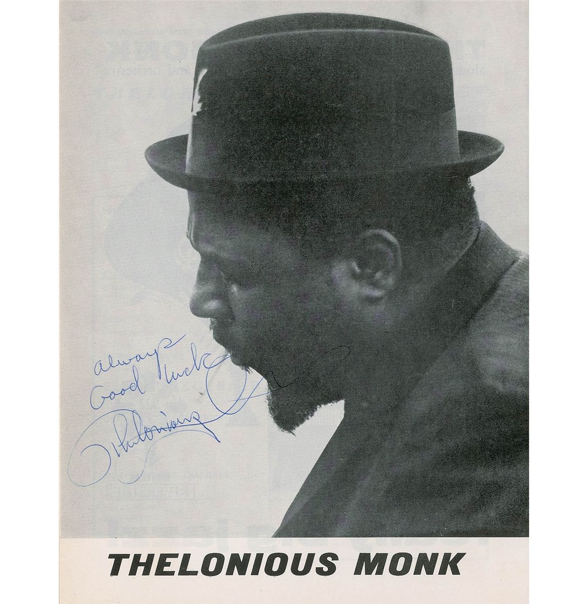Idiosyncratic pianist, composer, and arranger (1917–1982) who takes a place among the most innovative and influential figures of modern jazz. Vintage program for a performance of the Thelonious Monk Quartet in Amsterdam on February 15, 1964, featuring a large image of Monk on the cover, 8.5 x 11, two pages, signed on the front cover in blue ballpoint, “Always, good luck, Thelonious Monk.” Affixed to an off-white 9 x 13.5 scrapbook page. Light scattered surface creases, otherwise fine condition. It was while on this tour Monk appeared on the February 28, 1964, issue of Time magazine, featured in an article by Barry Farrell entitled ‘The Loneliest Monk.’ A fantastic example of one of jazz’s toughest signatures.