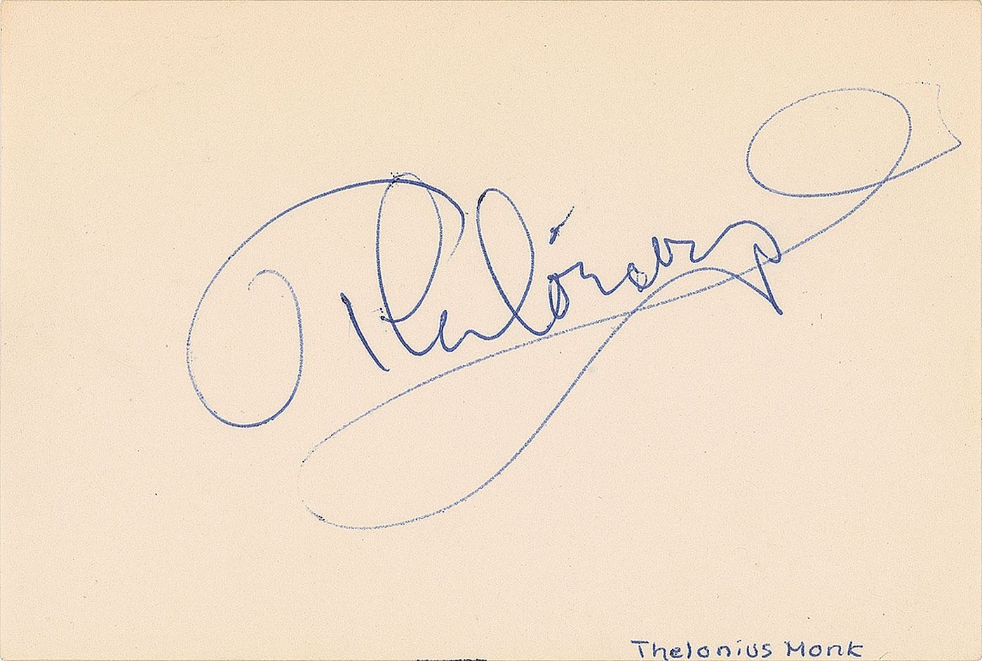 Idiosyncratic pianist, composer, and arranger (1917–1982) who takes a place among the most innovative and influential figures of modern jazz. Vintage ballpoint signature, "Thelonius Monk,” on an off-white 4.75 x 3.25 sheet. In very fine condition.