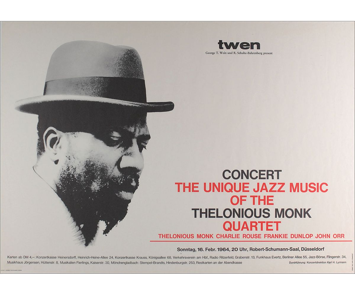 Uncommon original color 33 x 23 poster for the Thelonius Monk Quartet’s February 16, 1964, concert in Dusseldorf, Germany. Poster features a large image of Monk on the left side, with venue and ticket information printed along the bottom. In fine condition, with some scattered light creases. Rolled.