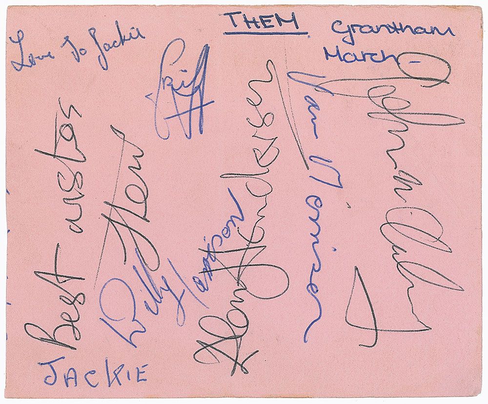 Vintage ballpoint signatures of Van Morrison, Alan Henderson, Billy Harrison, Jackie McAuley, and one other on a light pink 5 x 4 album page. Album page also bears an inscription and ballpoint notations to upper and lower borders. In very good to fine condition, with scattered creases. Accompanied by a certificate of authenticity from Tracks.