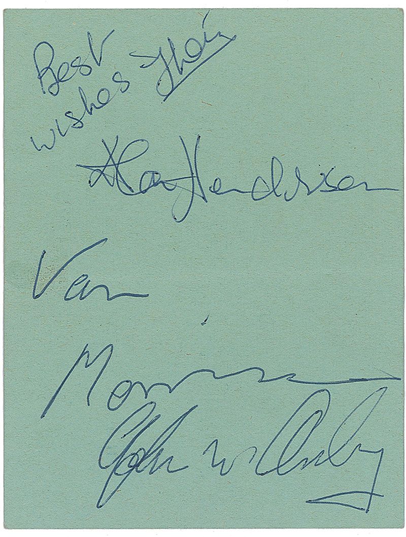 Concert ticket from a Jimmy Nicol and the Shubdubs show at the Imperial Ballroom in Nelson, 4.5 x 3.5, signed on the reverse in ballpoint by Van Morrison, Jackie McAuley, and Alan Henderson, adding, “Best wishes, Them.” In fine condition, with a central horizontal fold passing through Morrison’s first name.