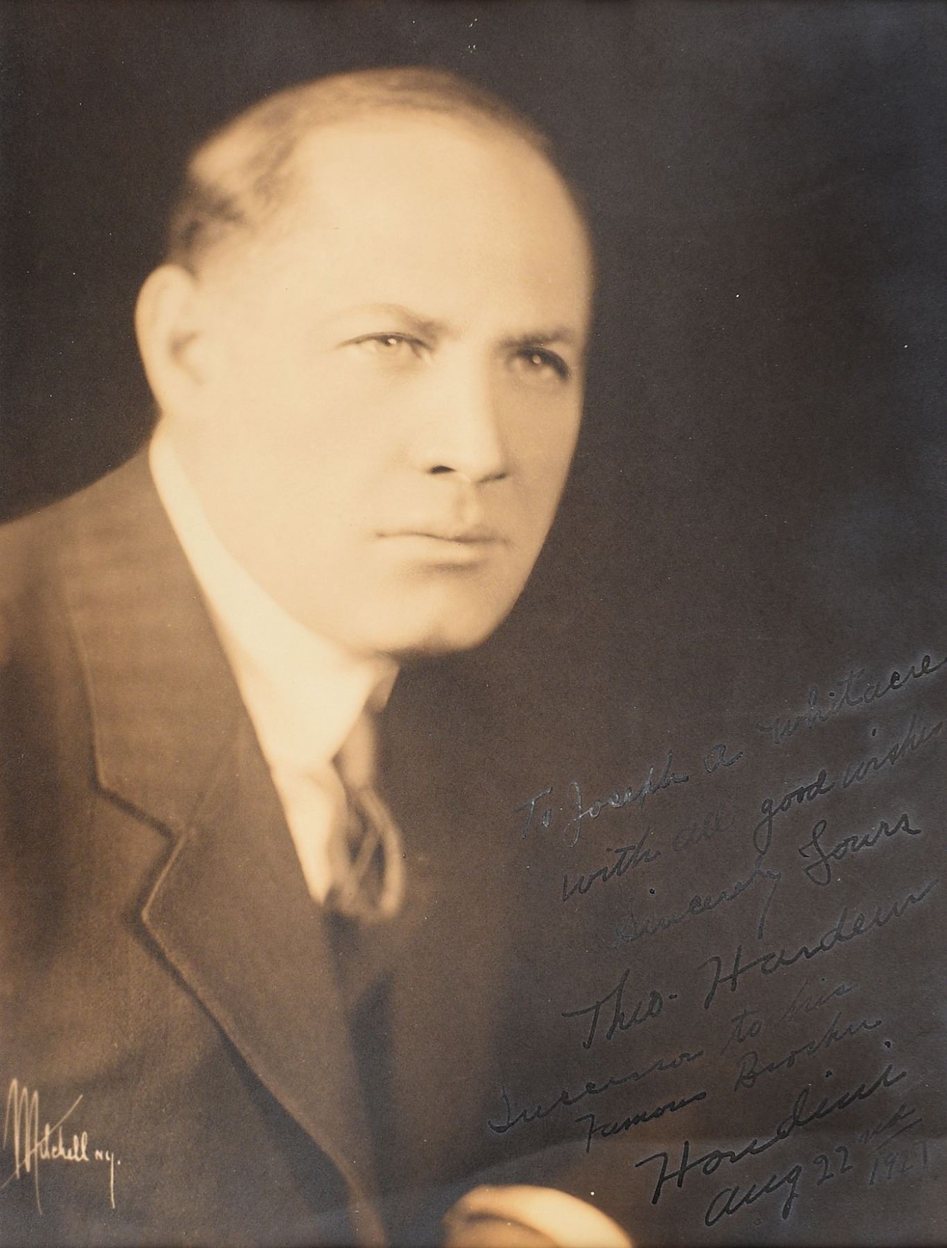 Hungarian magician and escape artist (1876–1945) who was the younger brother of Harry Houdini. The founder of the Magician's Guild, Hardeen was the first magician to conceive escaping from a straitjacket in full view of the audience, rather than from behind a curtain. Vintage matte-finish 9.5 x 12.5 portrait of Hardeen by the Mitchell Studio of New York, signed and inscribed in fountain pen, "To Joseph A. Whitacre, with all good wishes, sincerely yours, Theo. Hardeen, Successor to his famous brother, Houdini, Aug. 22nd, 1927.” Double-matted to an overall size of 14 x 18. In fine condition, with a couple of very light creases, and silvering to the ink which affects the readability of the start of the inscription.