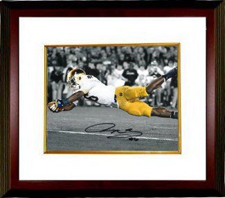 In his final season, as a senior in 2012, Theo Riddick made the move back to running back from wide receiver. Splitting carries with fellow senior classmate Cierre Wood, he rushed for 917 yards on 190 carries and five touchdowns. He also recorded 36 receptions for 370 yards and two touchdowns. Theo Riddick has hand signed this Notre Dame Fighting Irish 8x10 Spotlight Photo. Private Signing March 30th, 2013 in Lima, OH. Certificate of Authenticity from Athlon Sports. Custom White Mat and Premium Mahogany Framed as shown.