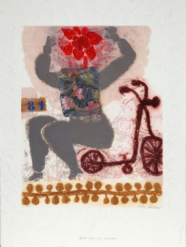 Theo Tobiasse, Femme Fleur Avec Bicycle, Aquatint Etching with Carborundum