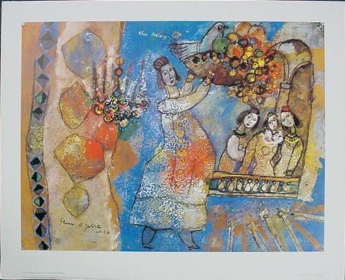 This lively and dynamic print by famous artist Theo Tobiasse is entitled "Romeo et Juliette Acte I/III." The artist shows us the moment before the real action of the play begins — the servant signaling the start of the feast where Romeo and Juliet will — finally (after the expository scene iv) — meet and begin their tragic journey towards theatrical immortality. We believe that Juliet, her mother and nurse are standing on the balcony waiting for the guests to arrive: * Title: "Romeo et Juliette Acte I" * Off-set printing on semi gloss paper * Artist's signature appears in the plate UC * TT 7101 "Romeo et Juliette" Acte I by Theo Tobiasse LL corner of the margin * Touchstone Publishers LR corner of the margin * Sheet size: 25 × 30½ * LL and UL corner creases readily matted out * Otherwise very good condition; bright and fresh * * Born in Palestine in 1927 but raised in occupied Paris, Tobiasse spent the crucial years of his youth in hiding from the Nazis. After the war he worked as a commercial artist until 1961, when he turned to painting full time. He has enjoyed popular and critical recognition worldwide with one-man shows in most major markets including New York, Paris, Tel Aviv, Tokyo and Caracas. According to one art expert: "His paintings transcend history, blending images into one moment-warping time into the present tense; his past, his dreams, mythology, Judaic legends and, biblical stories all inter-twine to become understandable in today's terms." (Kenneth Nahan; Tobiasse ;Chaim Potok; Rizzoli; N.Y.; 1986) * * * An art bargain!