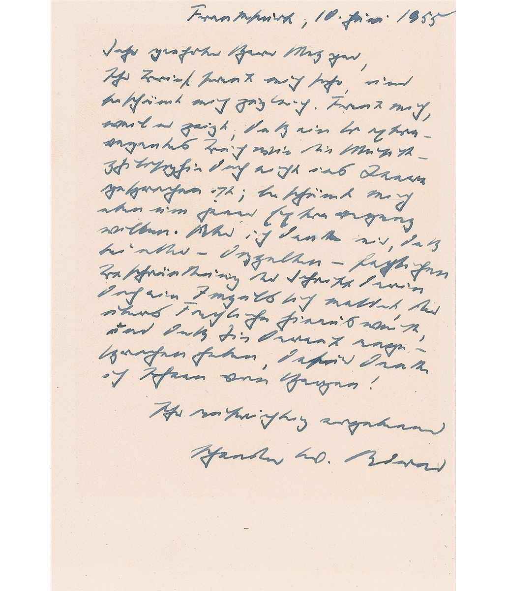 German sociologist, philosopher, and musicologist (1903–1969) known for his critical theory as a leading member of the Frankfurt School. ALS in German, signed “Theodor W. Adorno,” one page, 4 x 6, June 10, 1955. A thoughtful letter regarding his work. In part (translated): “Your letter pleased me very much and I am ashamed at the same time. I'm glad because it shows that a book so extravagant as the music philosophy is not spoken into the void; but I am ashamed for the sake of that extravagance.” In fine condition. A rare letter from the influential 20th-century thinker, who had published Philosophie der neuen Musik [Philosophy of New Music] in 1949. He argued that musical progress was proportional to the composer's ability to constructively deal with the possibilities and limitations contained within the ‘musical material,’ and that the objective validity of the composition rested with neither the composer's genius nor the work's conformity with prior standards, but with the way in which the work coherently expressed the dialectic of the material. The contemporary absence of composers of the status of Bach or Beethoven was not the sign of musical regression; instead, 'new music' was to be credited with laying bare aspects of the musical material previously repressed.
