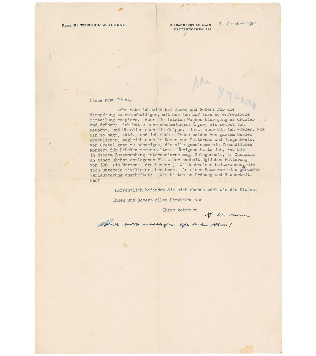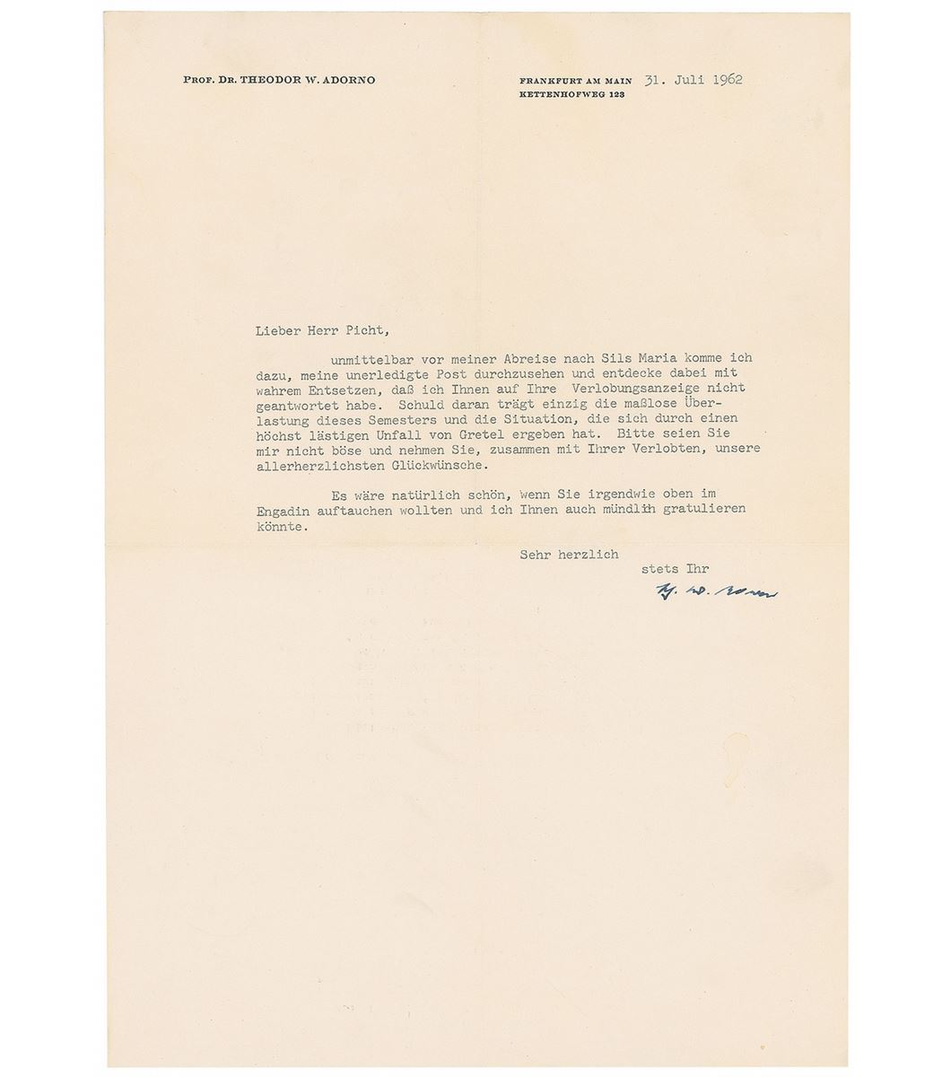 German sociologist, philosopher, and musicologist (1903–1969) known for his critical theory as a leading member of the Frankfurt School. Two untranslated TLSs, each signed “Th. W. Adorno,” one page, 8.25 x 11.75, 1962 and 1964. Both are to sociologist and linguist Robert Picht. The first congratulates him on his engagement. The second apologizes for a late response and bears a brief handwritten postscript at the conclusion. The earlier letter is in fine condition, the later in very good condition, with a tear to the top half of the page and scattered soiling.