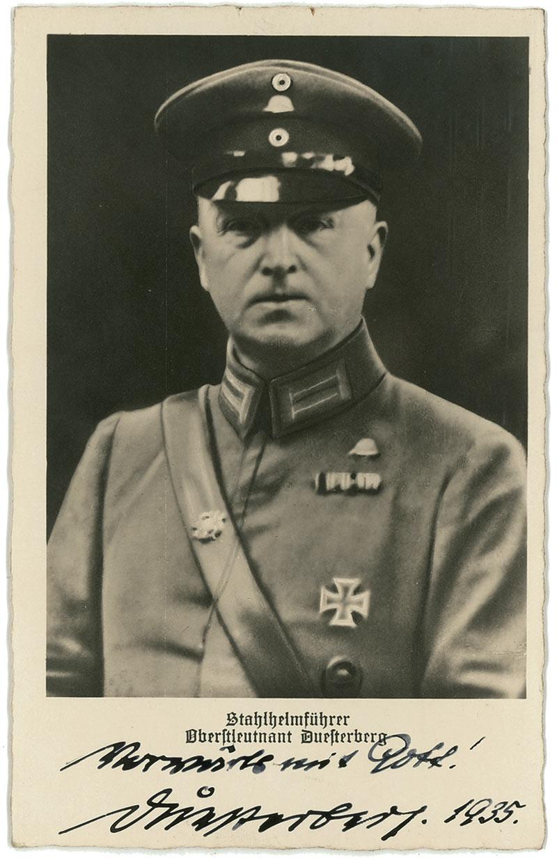 Leader of the Stahlhelm, Bund der Frontsoldaten (Steel Helmet League of Front Line Soldiers), in Germany prior to the Nazi seizure of power. Vintage 3.5 x 5.5 postcard photo of Duesterberg in uniform, signed in the lower border in black ink, in German (translated), “Forward with God! Duesterberg 1935.” In fine condition, with light postal impressions along right side. RRAuction COA.