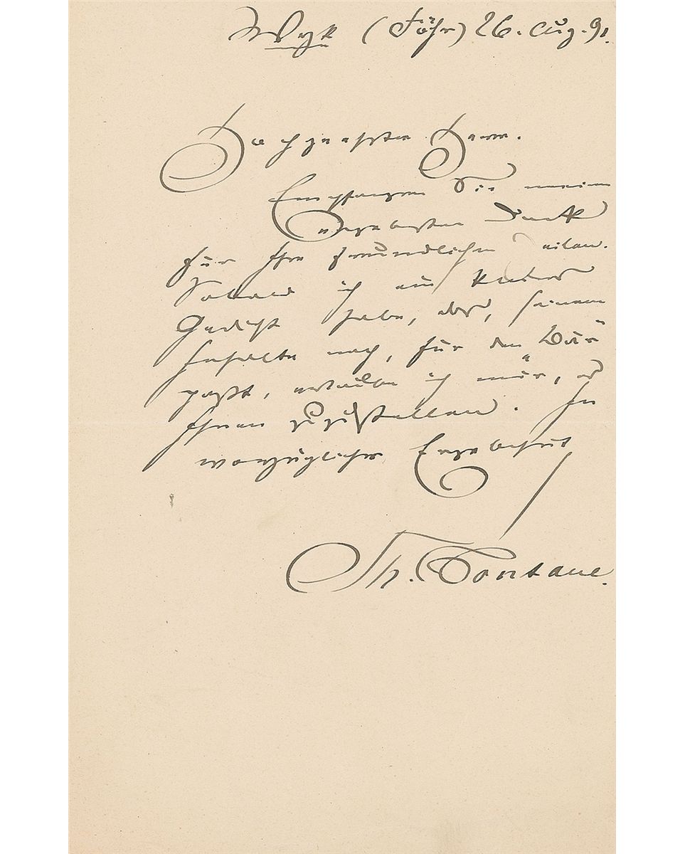 German novelist and poet, regarded by many as the most important 19th-century German-language realist writer (1819–1898). Choice ALS in German, signed “Th. Fontane,” one page, 5.5 x 8.5, August 26, 1891. Untranslated. In very fine condition.