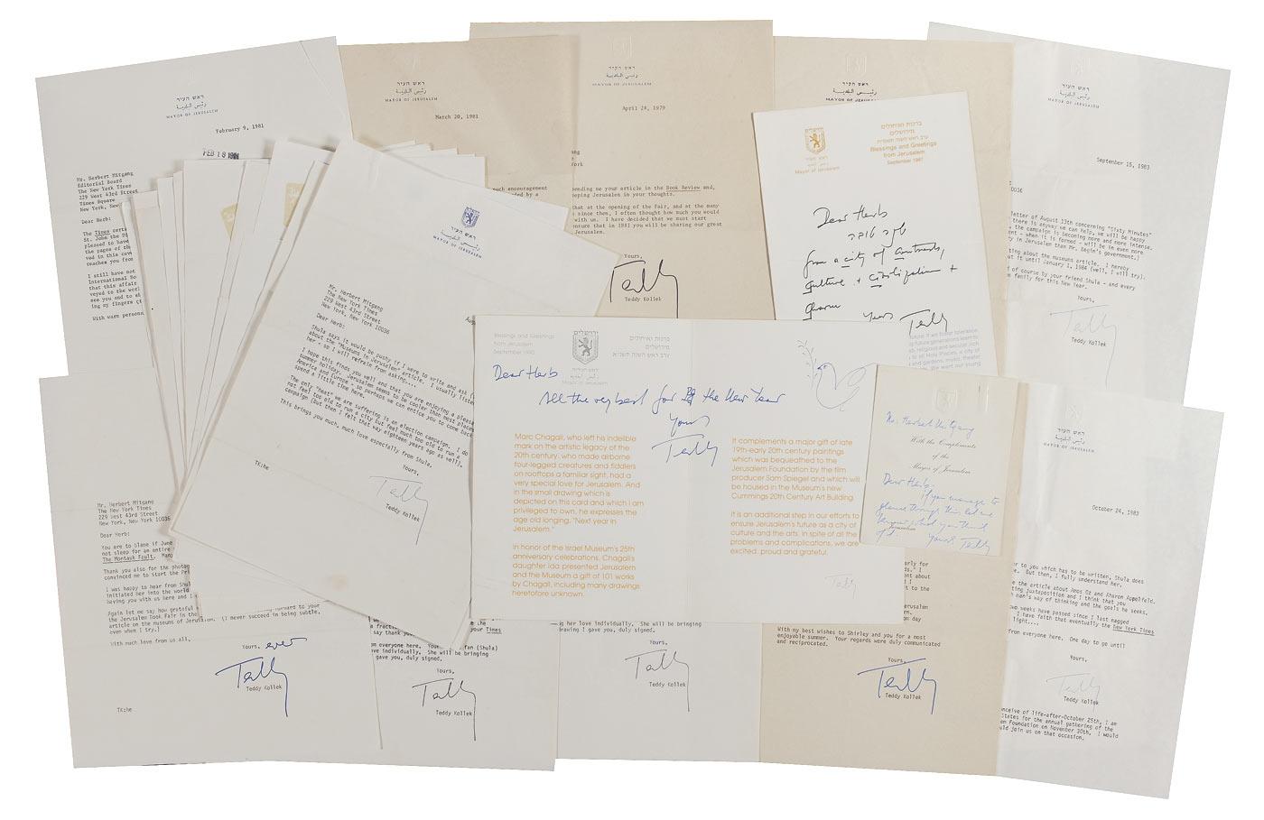 Israeli politician (1911–2007) who served as mayor of Jerusalem from 1965 to 1993. Thirty-one items, consisting mainly of one-page TLSs, signed “Teddy,” mostly on Mayor of Jerusalem letterhead, dating from 1977-1991; and three pre-printed note and holiday cards, all also signed “Teddy.” Extensive correspondence with Herbert Mitgang of The New York Times and others about book releases, published newspaper articles and current politics. In fine condition, with some light creases and paperclip impressions to top edges of some letters.