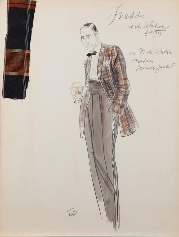 (Paramount, 1974) Pencil and watercolor on 15 x 20” 4-ply illustration board with fabric swatch affixed, executed and initialed by Theadora Van Runkle, and described by her as “Freddo at the Tahoe party in dark India Madras dinner jacket”. Van Runkle’s best work was for this, Godfather Part II, and the earlier Bonnie and Clyde, and she was recognized for both with Oscar nominations. Very Fine.