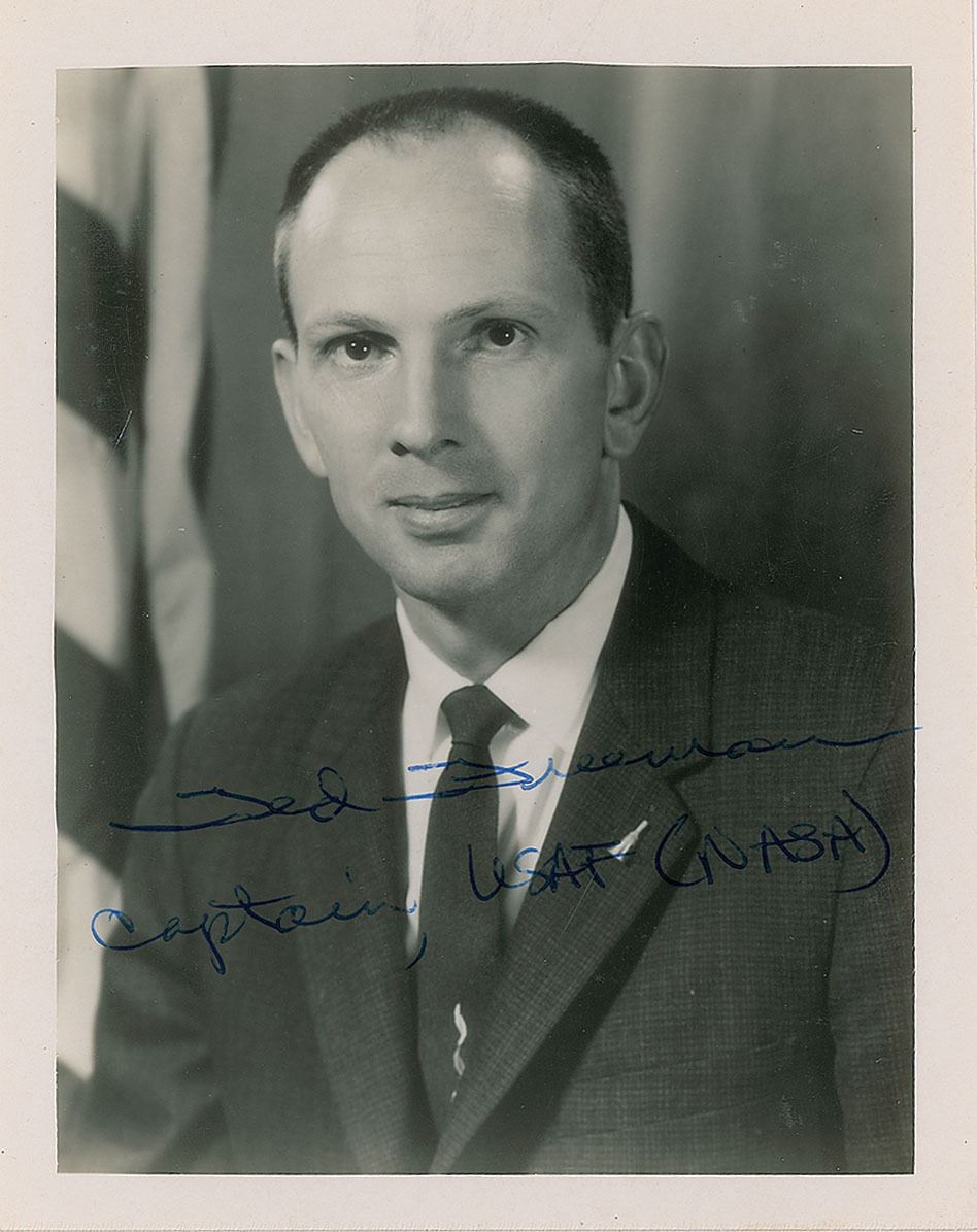 Vintage glossy 4 x 5 photo of Freeman in a suit and tie, signed in blue ballpoint, "Ted Freeman, Captain, USAF (NASA)." In fine condition, with moderate signature contrast, and scattered small surface impressions.