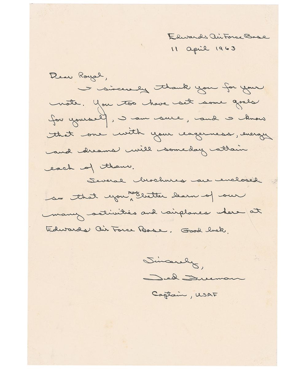 Air Force pilot (born 1930) selected as part of the third group of astronauts. Freeman was killed on October 31, 1964, when a goose smashed through the cockpit canopy of his T-38 Talon jet trainer. Flying shards of Plexiglas entered the jet engine intake and caused the engine to flameout. Freeman ejected from the stricken aircraft, but was too close to the ground for his parachute to open properly. ALS signed “Ted Freeman, Captain, USAF,” one page, 7.25 x 10.5, April 11, 1963. Letter to a flight enthusiast. In full: “I sincerely thank you for your note. You too have set some goals for yourself, I am sure, and I know that one with your eagerness, energy and dreams will someday attain each of them. Several brochures are enclosed so that you may better learn of our many activities and airplanes here at Edwards Air Force Base. Good luck.” In fine condition.