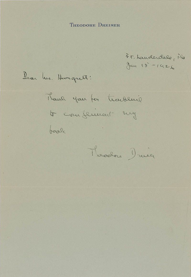 ALS, one page, 7.25 x 10.5, personal letterhead, January 15, 1926. Letter to an admirer. In full: “Thank you for troubling to compliment my book.” In fine condition. Accompanied by the original mailing envelope filled out by Dreiser, who signs again in the return address area on the reverse.