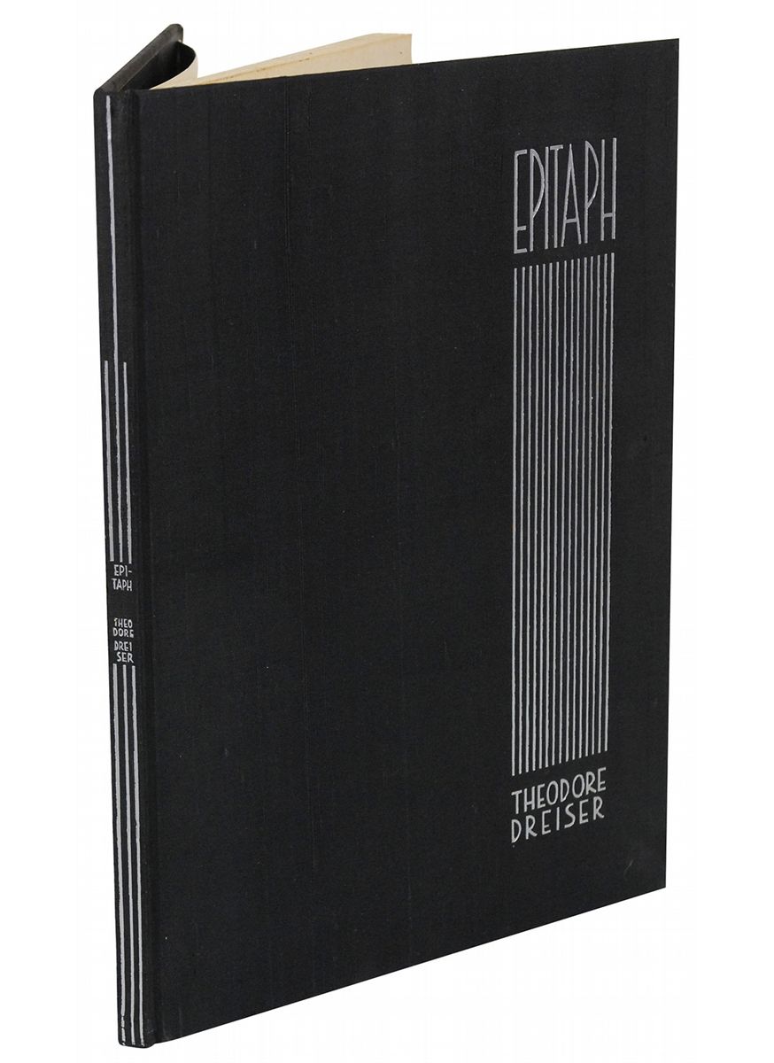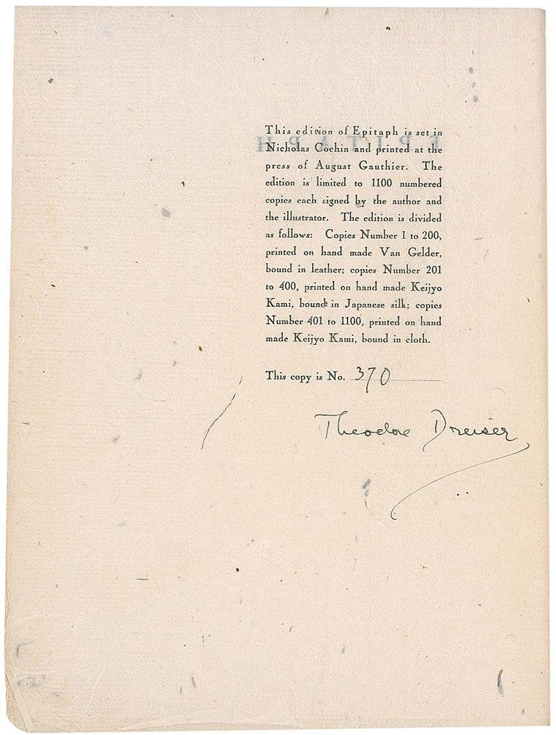 Signed book: Epitaph. Limited edition of 1100 copies (this being No. 370). NY: Heron Press, 1929. Hardcover, 9 x 12. Signed on the colophon by Dreiser and also signed by the illustrator, Robert Fawcett, beneath a woodcut on the following page. Autographic condition: fine. Book condition: VG+/None. Beautifully bound in black Japanese silk with silver stamped lettering and decoration, and printed on handmade Korean Keijyo Kami paper (hanji). Minor bump to spinetail; some scattered light foxing to textblock edges, with a few spots on interior; very faint discoloration to endpapers.