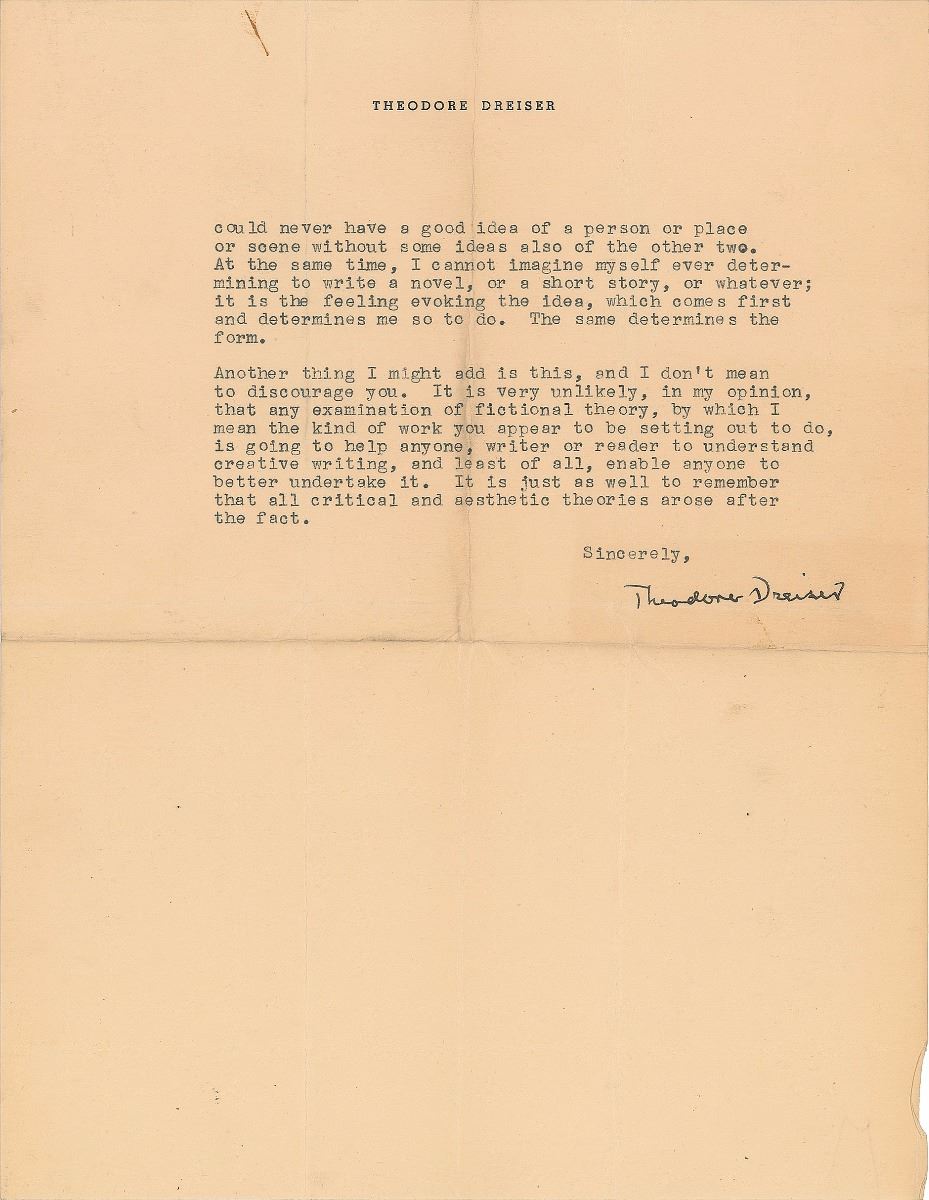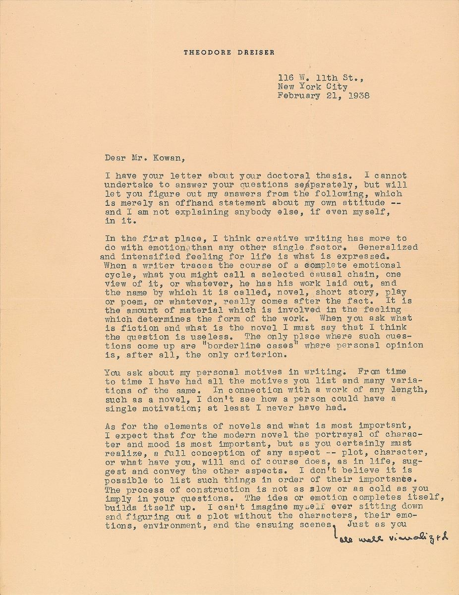 TLS, two pages, 8.5 x 11, personal letterhead, February 21, 1938. Letter to Mr. Kowan, in part: “I think creative writing has more to do with emotion than any other single factor. Generalized and intensified feeling for life is what is expressed. When a writer traces the course of a complete emotional cycle, what you might call a selected causal chain, one view of it, of whatever, he has his work laid out, and the name by which it is called, novel, short story, play or poem, or whatever, really comes after the fact. It is the amount of material which is involved in the feeling which determines the form of the work. When you ask what is fiction and what is the novel I must say that I think the question is useless. The only place where such questions come up are ‘borderline cases’ where personal opinion is, after all, the only criterion.” Dreiser makes a single correction to the text. In very good to fine condition, with intersecting folds, and light block of toning over the signature. Accompanied by the original mailing envelope.