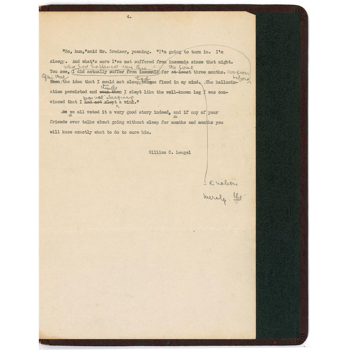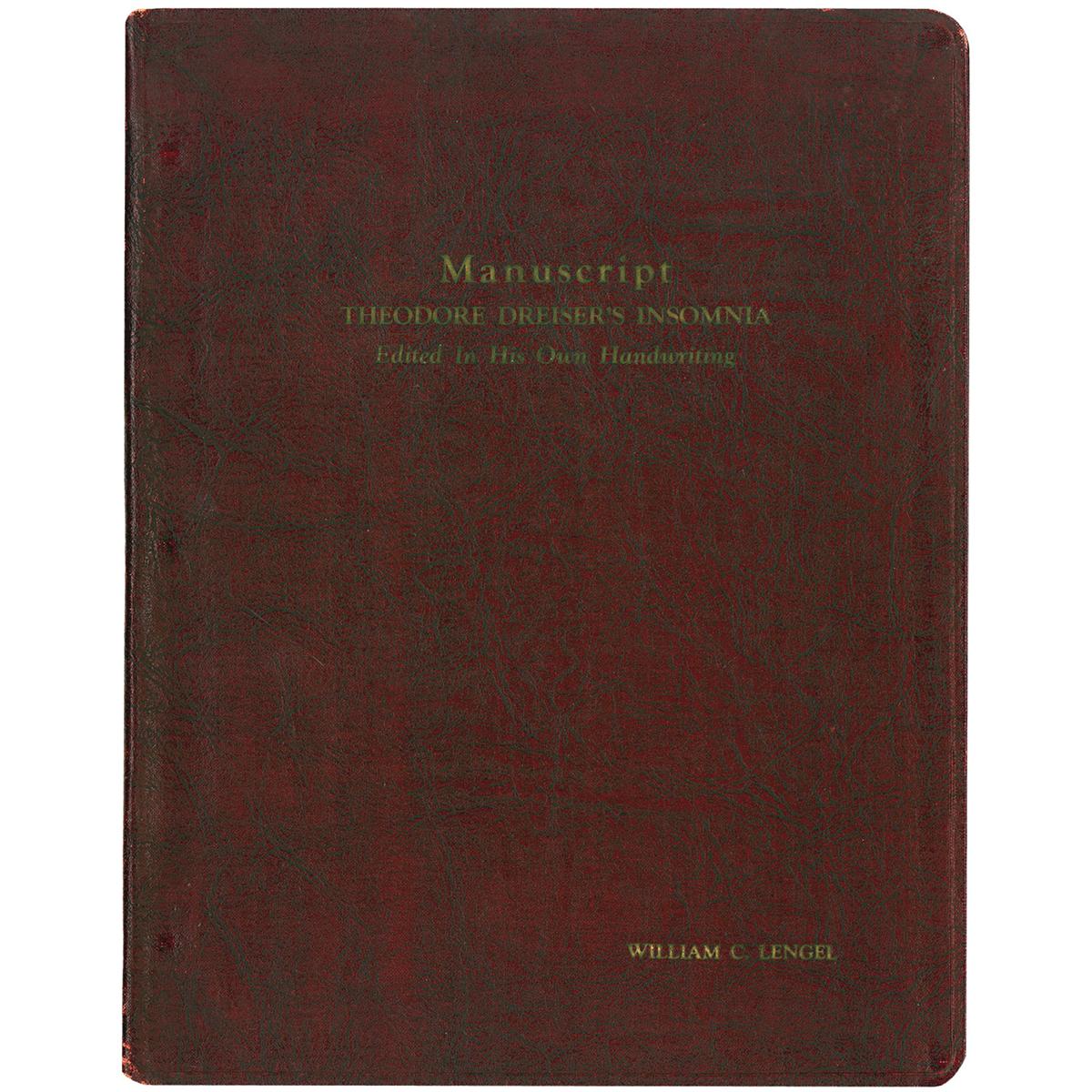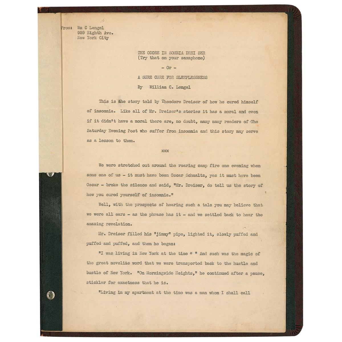ALS in pencil signed “TD,” one page, 3.5 x 5.5, no date. Dreiser writes to Lengel. In full: “With these corrections—(Maybe not all) I seek U: OK. Very good indeed. All my dearest love…” Also: carbon copy of an original article “The Odore in Somnia Drei Ser” by William C. Lengel, 4 pages, 8.25 x 11.25, no date. Lengel’s New York City address is typed in the upper left of the first page. The complete title of the article is “THE ODORE IN SOMNIA DREISER/(Try that on your saxaphone)/-Or-/A SURE CURE FOR SLEEPLESSNESS” by William C. Lengel. Dresier has made numerous pencil corrections on two pages, adding a total of nearly 100 words. Page three has apparently been crumpled by mistake and then flattened. Lengel’s introduction, in full: “This is the story told by Theodore Dreiser of how he cured himself of insomnia. Like all of Mr. Dreiser’s stories it has a moral and even if it didn’t have a moral there are, no doubt, many many readers of The Saturday Evening Post who suffer from insomnia and this story may serve as a lesson to them.” The following, in which Dreiser writes of the time “it seemed there were weeks on weeks when I did not sleep a wink,” is from page two. The words in brackets were handwritten by Dreiser: “Often in the dead of night [during the first three months mind you—not afterwards] after tossing restlessly in my bed I would get up and sit on a bench in the park or walk under the stars and then as dawn was breaking I would go back to bed and perhaps have an hour’s fitful sleep.” After crossing out “So that I might have advantage of this brief period of rest I pulled,” Dreiser adds, “[Later, feeling myself to be in the grip of the same ill & tossing & tumbling as I was sure that I did I devised the scheme of pulling] down [my] shades and [drawing up] curtains so that the rays of the sun could not come in [and] waken me.” The corrected manuscript and Dreiser’s letter are housed together in a brad-bound leatherette folder imprinted on the cover “Manuscript/Theodore Dreiser’s Insomnia/Edited In His Own Handwriting”; Lengel’s name is imprinted at the lower right. In fine condition overall, with toning and scattered light wrinkling and handling wear. Lengel (1888-1965) was a novelist and playwright who was managing editor of Hearst’s International magazine and associate editor of Cosmopolitan and Liberty magazines. His obituary in the New York Times points out that “he liked to tell associates of his relationships with great writers, particularly Theodore Dreiser.” A rare example of the author at work.