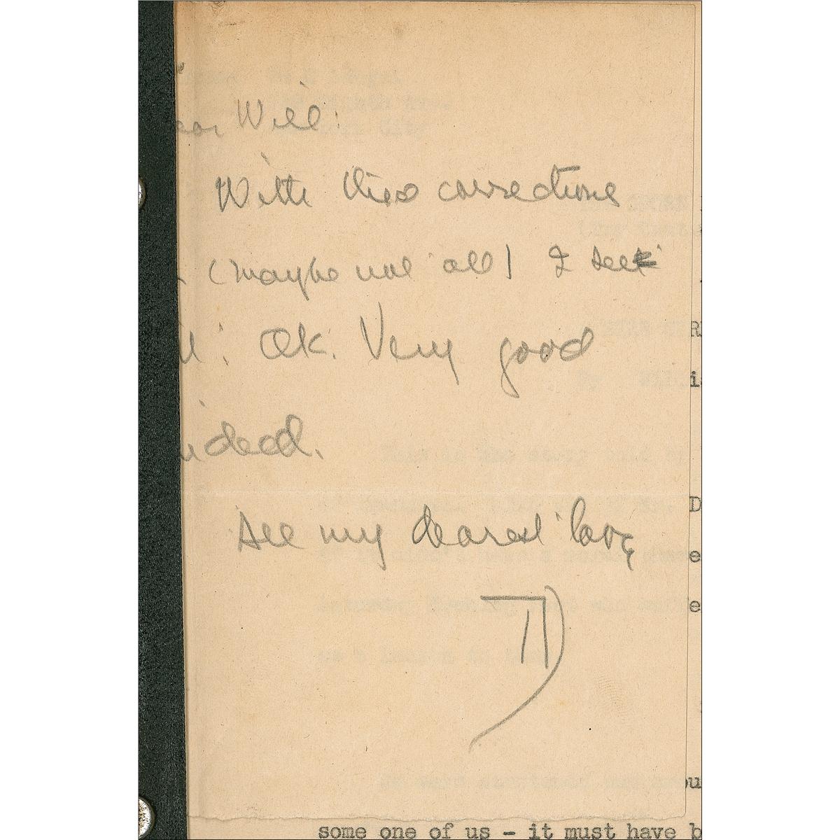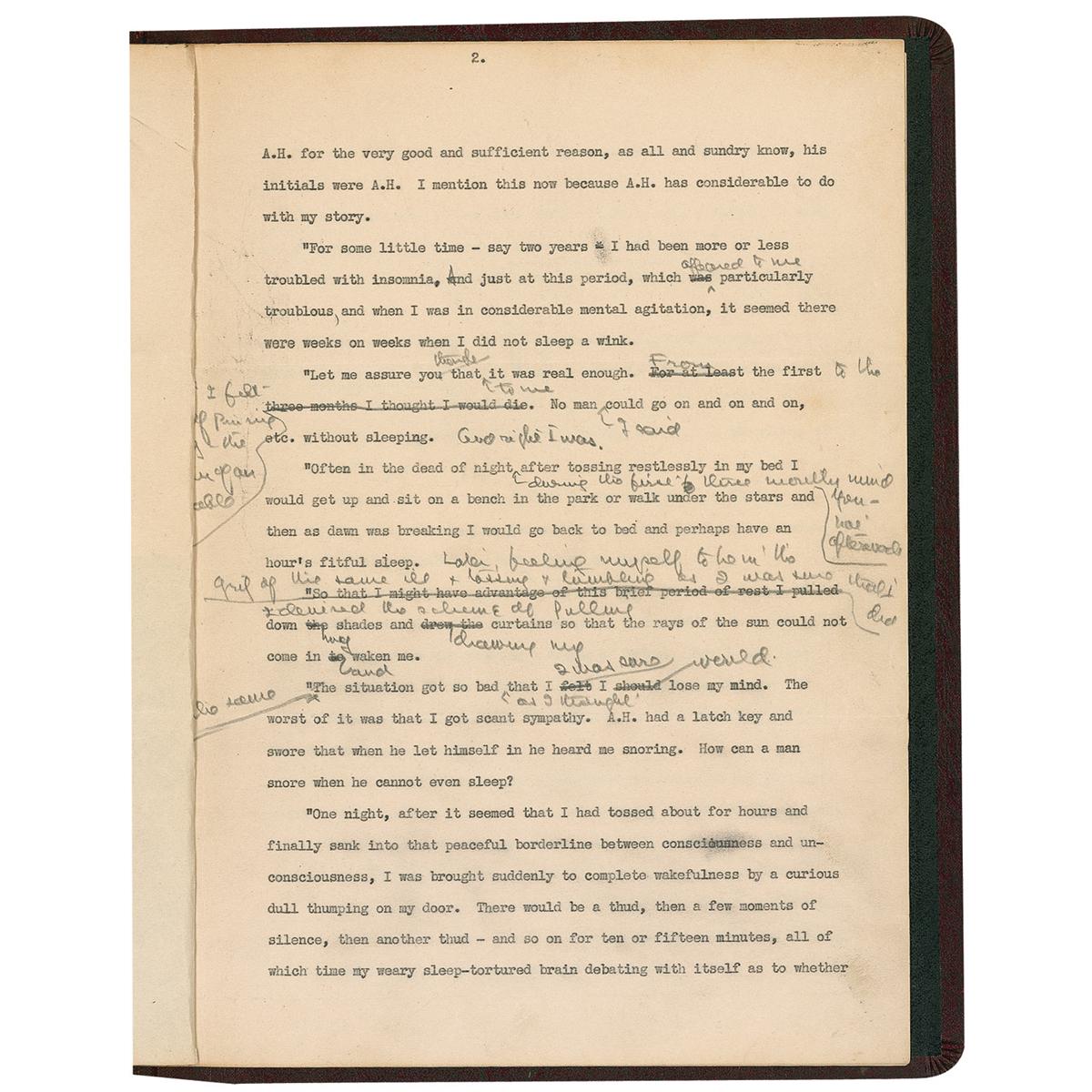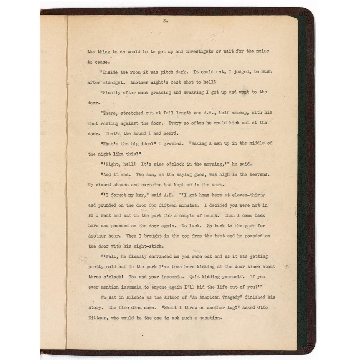 ALS in pencil signed “TD,” one page, 3.5 x 5.5, no date. Dreiser writes to Lengel. In full: “With these corrections—(Maybe not all) I seek U: OK. Very good indeed. All my dearest love…” Also: carbon copy of an original article “The Odore in Somnia Drei Ser” by William C. Lengel, 4 pages, 8.25 x 11.25, no date. Lengel’s New York City address is typed in the upper left of the first page. The complete title of the article is “THE ODORE IN SOMNIA DREISER/(Try that on your saxaphone)/-Or-/A SURE CURE FOR SLEEPLESSNESS” by William C. Lengel. Dresier has made numerous pencil corrections on two pages, adding a total of nearly 100 words. Page three has apparently been crumpled by mistake and then flattened. Lengel’s introduction, in full: “This is the story told by Theodore Dreiser of how he cured himself of insomnia. Like all of Mr. Dreiser’s stories it has a moral and even if it didn’t have a moral there are, no doubt, many many readers of The Saturday Evening Post who suffer from insomnia and this story may serve as a lesson to them.” The following, in which Dreiser writes of the time “it seemed there were weeks on weeks when I did not sleep a wink,” is from page two. The words in brackets were handwritten by Dreiser: “Often in the dead of night [during the first three months mind you—not afterwards] after tossing restlessly in my bed I would get up and sit on a bench in the park or walk under the stars and then as dawn was breaking I would go back to bed and perhaps have an hour’s fitful sleep.” After crossing out “So that I might have advantage of this brief period of rest I pulled,” Dreiser adds, “[Later, feeling myself to be in the grip of the same ill & tossing & tumbling as I was sure that I did I devised the scheme of pulling] down [my] shades and [drawing up] curtains so that the rays of the sun could not come in [and] waken me.” The corrected manuscript and Dreiser’s letter are housed together in a brad-bound leatherette folder imprinted on the cover “Manuscript/Theodore Dreiser’s Insomnia/Edited In His Own Handwriting”; Lengel’s name is imprinted at the lower right. In fine condition overall, with toning and scattered light wrinkling and handling wear. Lengel (1888-1965) was a novelist and playwright who was managing editor of Hearst’s International magazine and associate editor of Cosmopolitan and Liberty magazines. His obituary in the New York Times points out that “he liked to tell associates of his relationships with great writers, particularly Theodore Dreiser.” A rare example of the author at work.