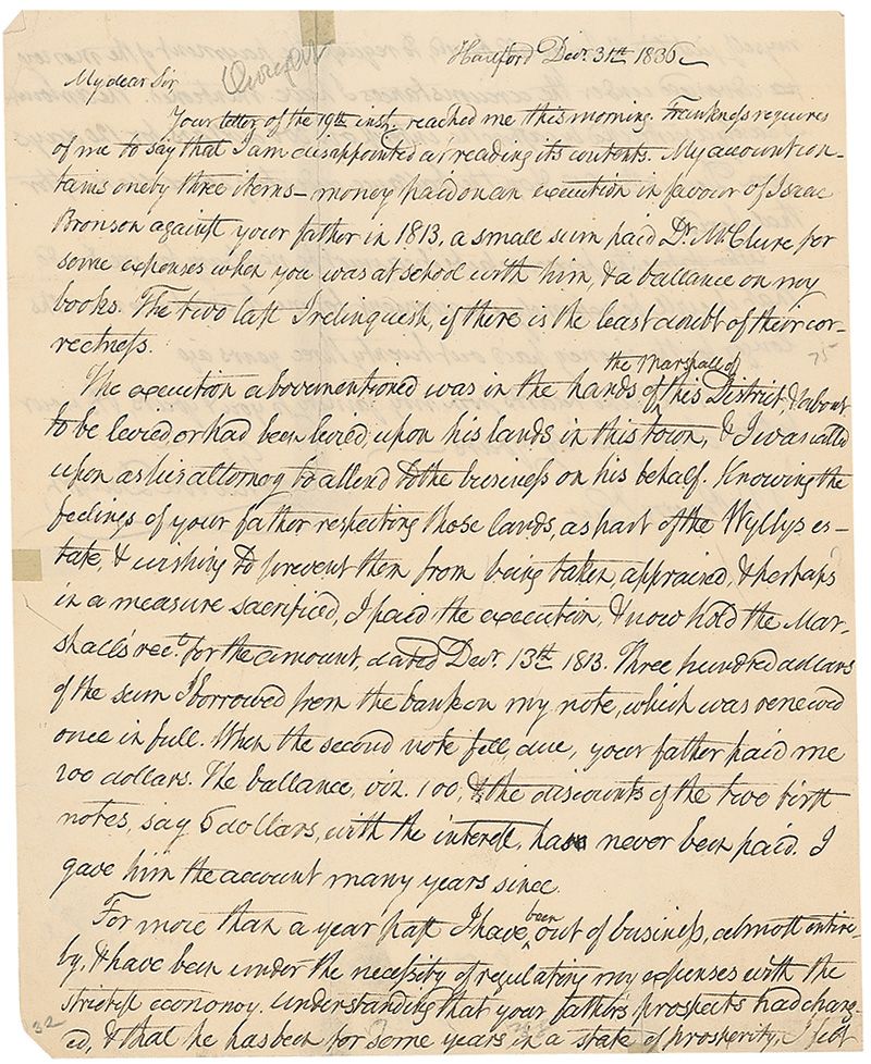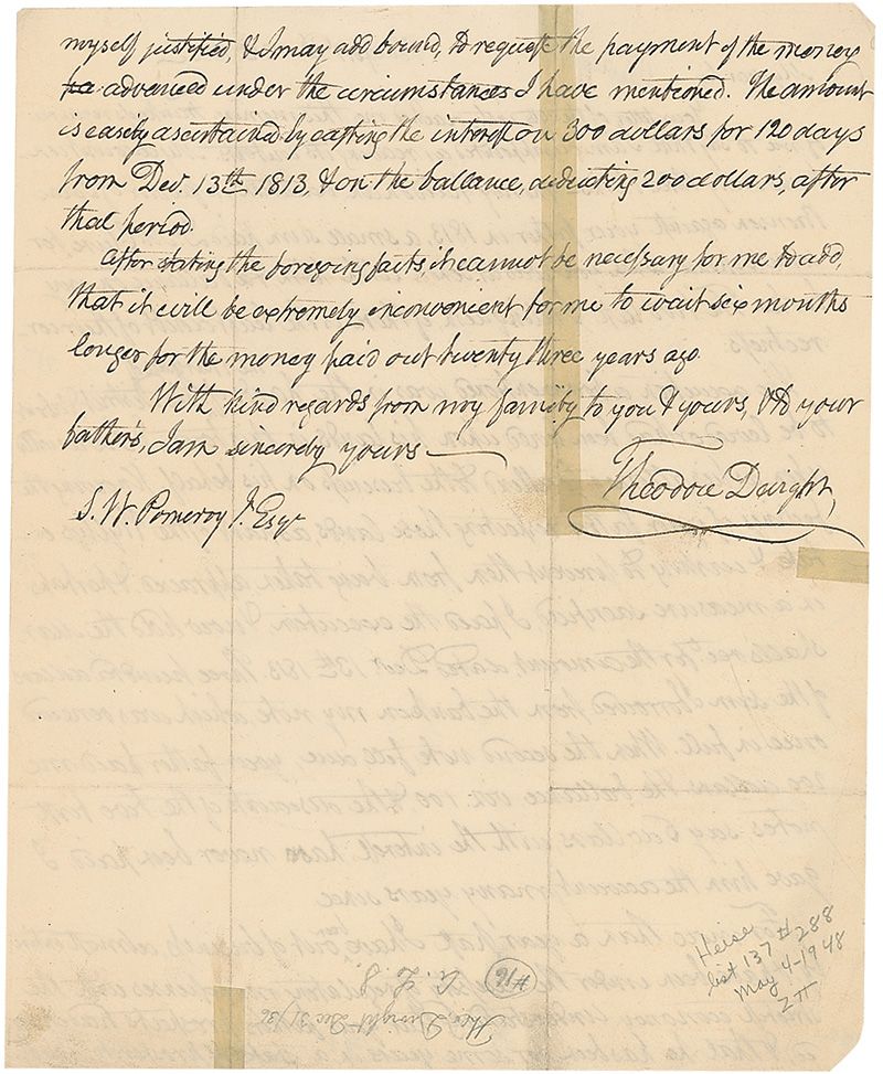 American lawyer and journalist (1764-1846). ALS, one page both sides, 7.75 x 9.5, December 31, 1836. Letter to S. W. Pomeroy, Jr. concerning a long due debt. In part: “Frankness requires of me to say that I am disappointed at reading its contents…For more than a year past I have been out of business, almost entirely, & have been under the necessity of regulating my expenses with the strictness economy. Understanding that your father’s prospects had changed, & that he has been for some years in a state of prosperity, I felt myself justified, & I may add bound, to request the payment of the money advanced.” In very good condition, with intersecting folds, with tape repairs to several folds, one lightly touching signature, several pencil notations, and some light toning and soiling. Provenance: Heise, 1948, Collection of Henry E. Luhrs.