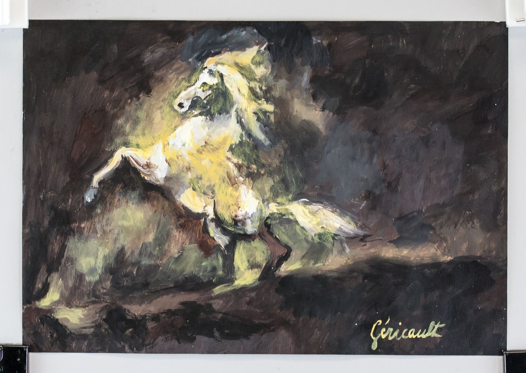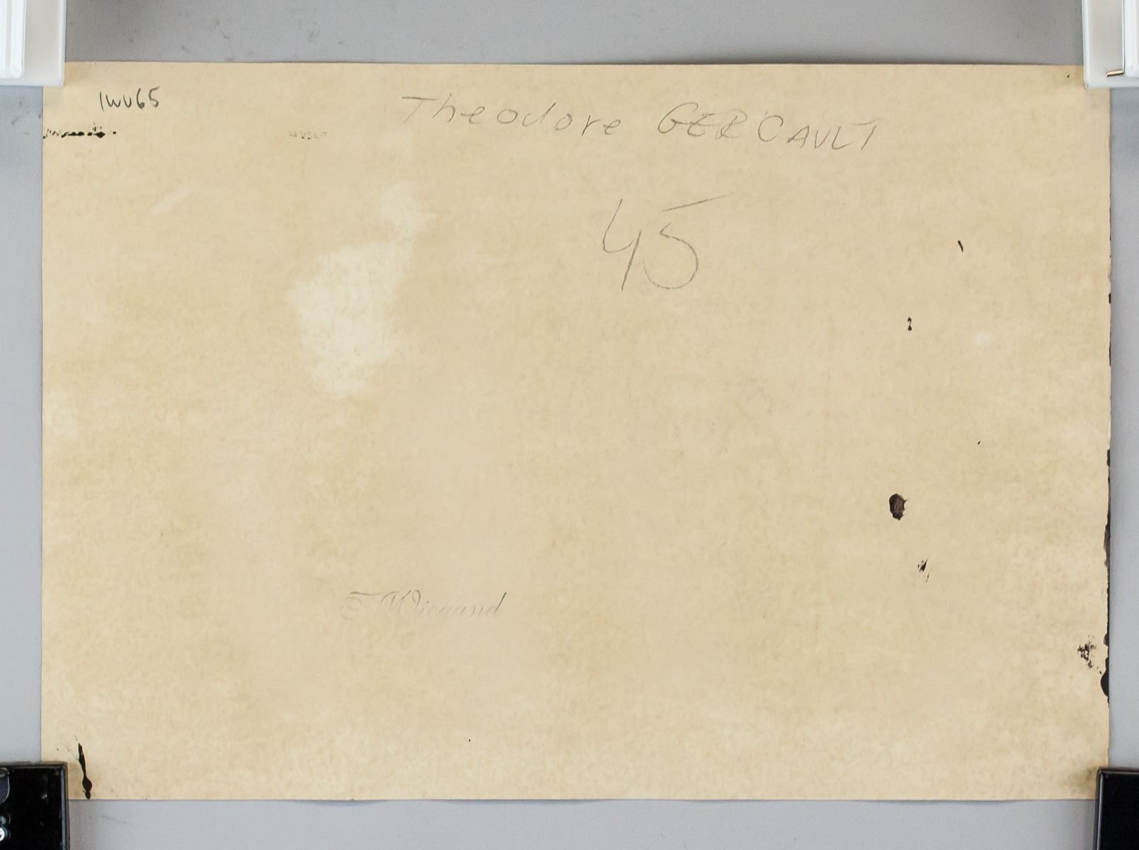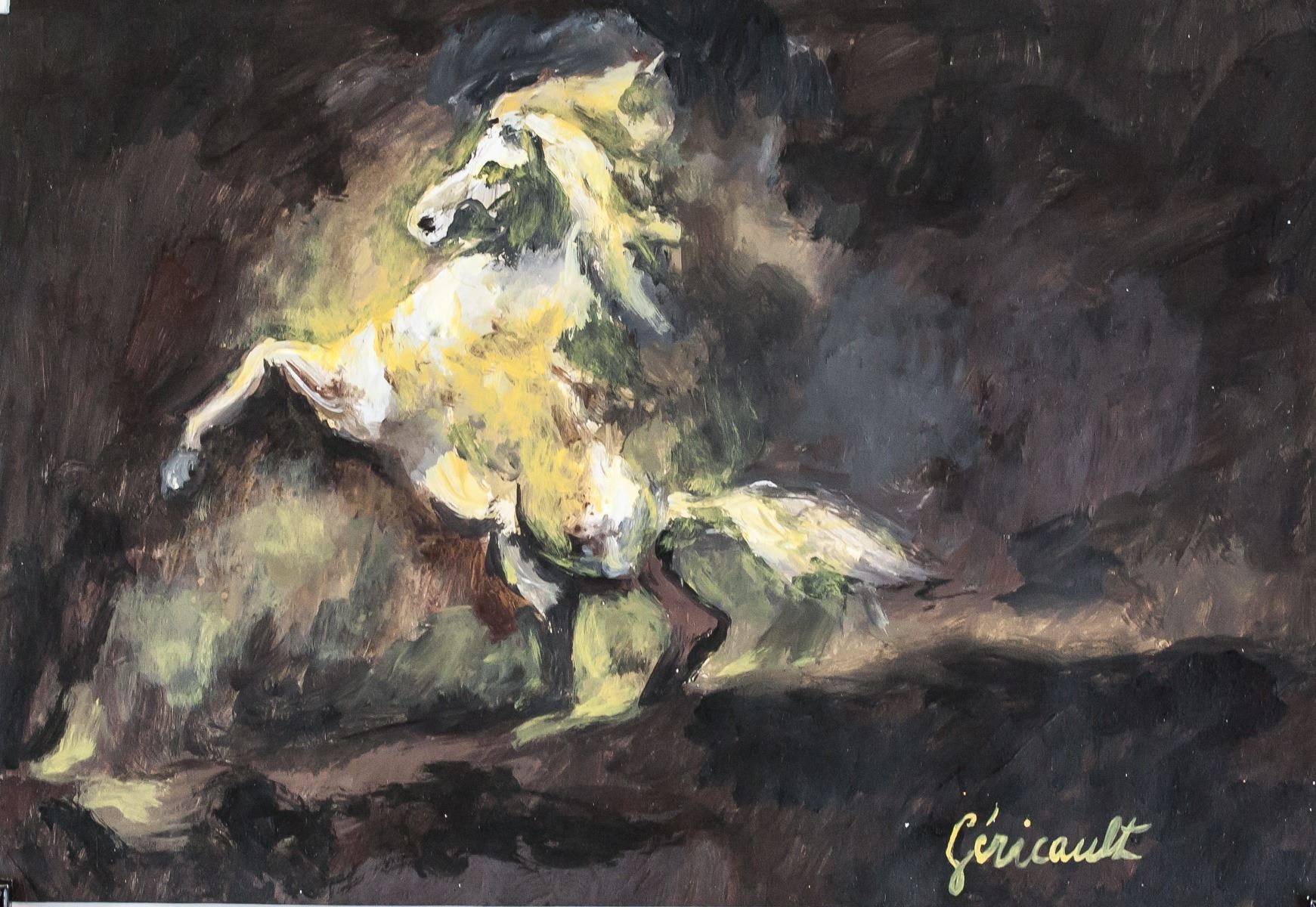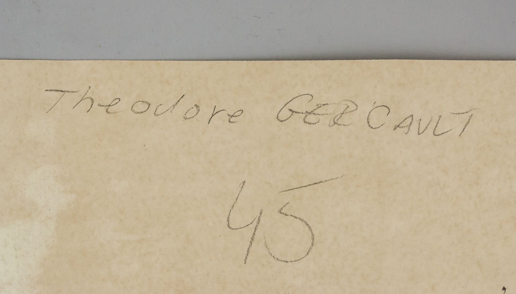 Oil and tempera on paper. Featuring a portrait of a horse. Signed Gericault on the lower right corner. Inscribed IWV65 on verso. Inscribed Theodore GERCAULT 45 on verso. Stamped F. Wiegand on verso. Attributed to Theodore Gericault (1791-1824, French). 19.7 x 28.5 cm (7.75 x 11.25 in). PROVENANCE: Southern Ontario estate