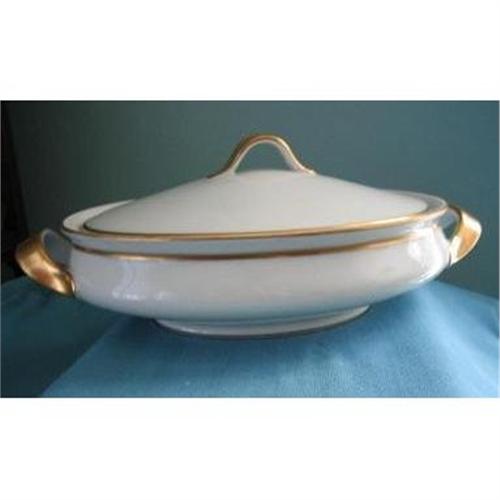 This lovely heavy gold banded covered casserole dish from the early 1900s is marked on the bottom in red: Theodore Haviland/Limoges/France. <BR>In my Kovel's Book of Marks has the Theodore Haviland/ Limoges/France done in red overglaze as being used from 1892-1913. <BR>In very good condition, without chips, cracks or fleabites, it does have a paint flaw on the handle, which I have shown in my pictures, and it measures 4 1/2 inches high, 7 1/2 inches wide and 12 inches handle to handle. I also have the matching cake plate of the same pattern for sale in my store, please see item #theocake1488, vegetable bowl item #theoveggie1489 and covered sugar bowl and creamer item #theosugr1542. A beautiful casserole that would dress up any table and an addition to any Theodore Haviland Limoges Collection.