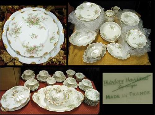 Theodore Haviland Limoges gold accented china. 12 dinners 10" across, 9 B&B I with edge chip, 11 soup bowls, 8 berry bowls, butter dish with insert, 9 saucers 1 repaired, 9 cups 2 repaired, 16 1/2" platter, Sugar has a chip on the bottom. Lots of extras