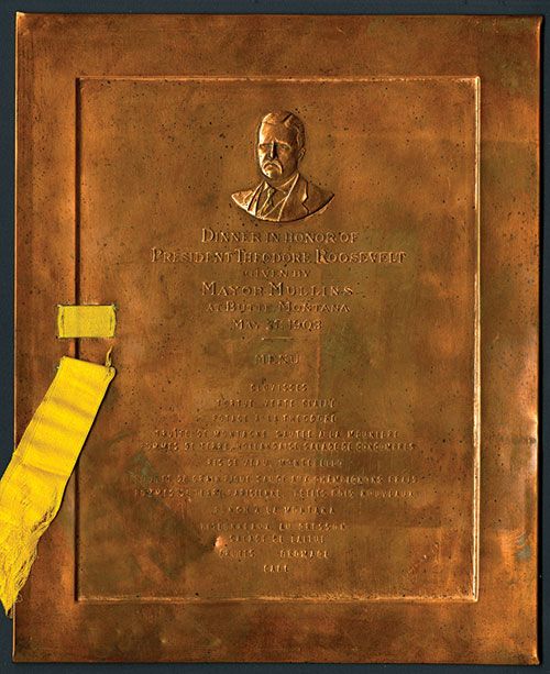 Butte, Montana, May 27, 1903, 8.5 x 10.25 inches, Rooselvelt's embossed portrait on top with menu below printed on copper plate with attached yellow ribbon. Evidently touting Montana's copper producers. VF to XF condition with original folder that has detached. Menu written in French. Attractive and rare Western copper mining related presidential ephemera.