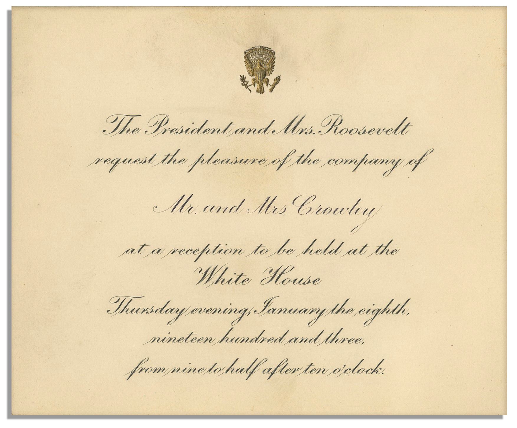 President Theodore Roosevelt and First Lady Edith Roosevelt official invitation to the White House for a reception held 8 January 1903. Invitation has a gilt embossed Presidential seal at top and reads in full, ''The President and Mrs. Roosevelt request the pleasure of the company of Mr. and Mrs. Crowley at a reception to be held at the White House Thursday evening January the eight nineteen hundred and three from nine to half after ten o'clock''. Measures 5'' x 4.25''. Toning, otherwise near fine.