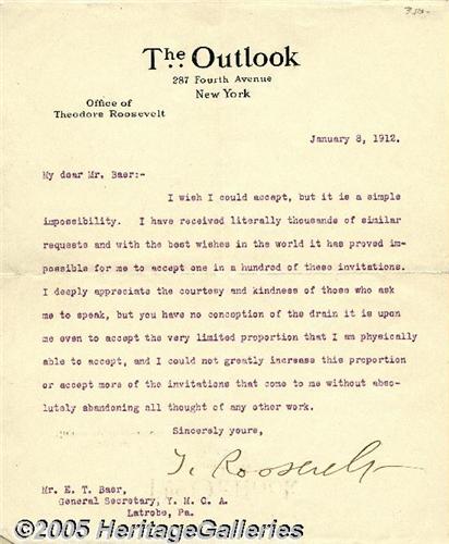 <B>Theodore Roosevelt 1912 Typed Letter Signed to Y.M.C.A.</B></I> Typed letter signed "T. Roosevelt", 6.5" x 7.75", New York, January 8, 1912 to E.T. Basr of the Y.M.C.A. of Latrobe, Pennsylvania, declining an invitation. An apologetic letter noting that "...I have received literally thousands of similar requests and with the best wishes in the world it has proved impossible for me to accept one in a hundred of those invitations. I deeply appreciate the courtesy and kindness of those who ask me to speak, but you have no conception of the drain it is upon me even to accept the very limited proportion that I am physically able to accept, and I could not greatly increase this proportion or accept more of the invitations that come to me without absolutely abandoning all thought of any other work..." At the time, Roosevelt was getting ready for another run at the Republican nomination for President, accusing Taft's administration of betraying his progressive program. He failed to secure the Republican nomination and ended up running against his successor in a three-way race which threw the election to the Democrat, Woodrow Wilson. Very light horizontal crease, otherwise in excellent condition with a large, bold signature. <I>Accompanied by COA from PSA/DNA.</B></I>