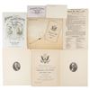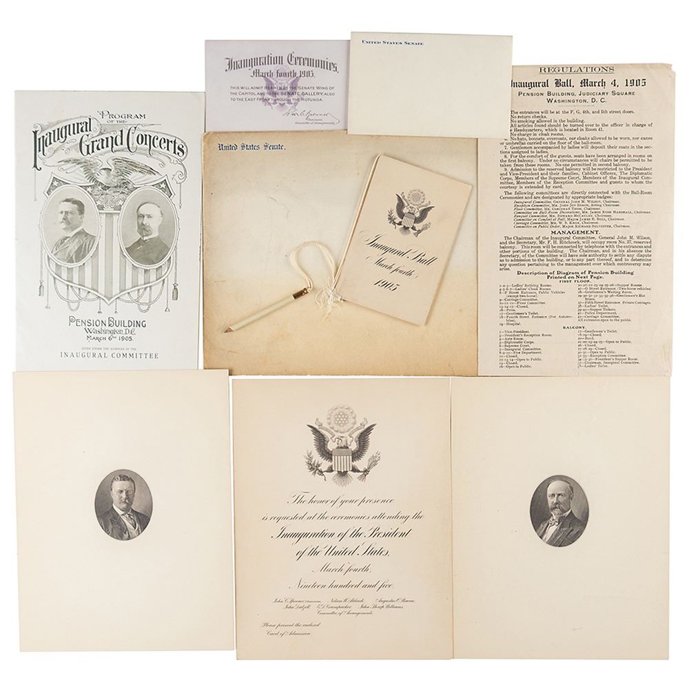 Five items from President Theodore Roosevelt's second inauguration on March 4, 1905, including: a Congressional invitation packet, complete with invitation to the Inauguration Ceremonies, engraved portraits of Roosevelt and Fairbanks, and United States Senate envelope; official admission pass to the Senate Gallery for the Inauguration Ceremonies, with its United States Senate envelope; a 1905 Inaugural Ball pocket program with attached pencil; a double-sided "Regulations" flyer for the Inaugural Ball, with printed diagram of the Pension Building on the reverse; and an official program for the Inaugural Grand Concerts, hosted at the Pension Building on March 6, 1905. In overall very good to fine condition.