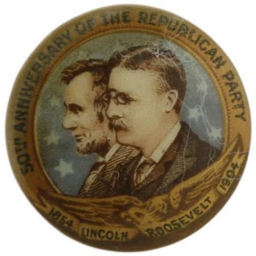 <B> Theodore Roosevelt:7/8" Campaign Pin for 1904</B></I> with a portrait of Lincoln beside Roosevelt, made for the Republican Party Anniversary. The button in choice condition has a starry blue background and color portraits of the two.<BR><BR><b>Shipping:</b> Miscellaneous Collectibles, Smal (<a target="_blank" href="http://www.heritageauctions.com/common/shipping.php">view shipping information</a>)