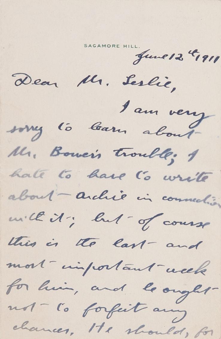 Autograph letter signed ''Theodore Roosevelt'' on Sagamore Hill embossed stationery and dated 12 June 1911. In part, ''...I hate to have to write about Archie in connection with it; but of course this is the last and most important week for him, and he ought not to forfeit any chances. He should, for this week, have one tutor all the time, for each subject; will you arrange this?'' Two pages on two sheets measure 4.5'' x 7''. Lightly dampstained in the center of each page, slightly affecting the signature. Very good condition.