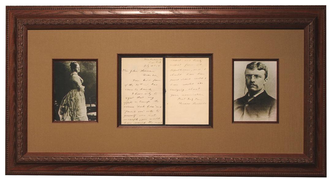 Theodore Roosevelt autograph letter signed as New York State Assemblyman, dated 12 July 1884. Addressed to Senator John Sherman and signed, ''Most Truly Yours / Theodore Roosevelt'' letter reads in part, ''…you would have received the most cardinal and hearty support from all Republicans…'' Letter is on two pages, measuring 4'' x 6.25'' each, and framed side by side. Cherry wood frame measures 30.75'' x 16.5'' with dark khaki-colored mat. Includes photos of Roosevelt and his wife Alice Hathaway Lee. One mailing fold, else fine condition.