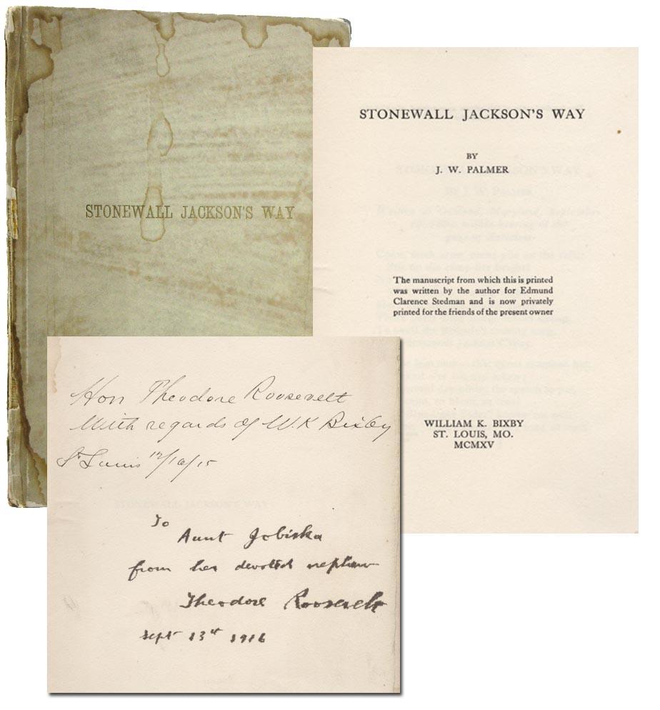 Theodore Roosevelt signed copy of ''Stonewall Jackson's Way'' by J.W. Palmer. With two inscriptions, the first to Roosevelt from W.K. Bixby and the second from Roosevelt to Mattie Waller Johnson, reading, ''To Aunt Jobinska from her devoted nephew / Theodore Roosevelt / Sept 13th 1916''. Roosevelt is making a reference to a character in Edward Lear's poem, ''The Pobble Who Has No Toes.'' Bound in original boards measuring 6.5'' x 9'', with some dampstaining on covers and lower corners of pages, and tearing at spine. Good condition.