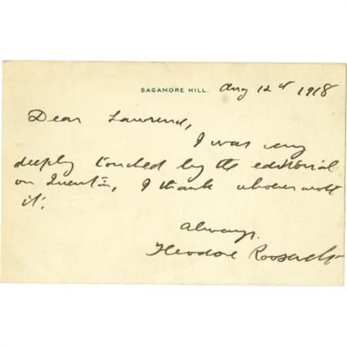 <B>Theodore Roosevelt Sends Thanks for an Article Eulogizing His Recently Deceased Son, Quentin</B></I> Brief, but poignant ALS, 1 page, 5.75" x 3.75", Sagamore Hill, Aug. 12, 1918. In full: "<I>Dear Lawrence, I was very deeply touched by the editorial on Quentin. I thank whoever wrote it. Always, Theodore Roosevelt</B></I>". Quentin, Roosevelt's youngest and favorite son, had died less than a month earlier in an air fight over France on July 12, 1918. His death was mourned worldwide, and the Germans buried the young hero with full honors in recognition of his valor and skill, but also because of their respect and admiration for Theodore. The senior Roosevelt had been an outspoken supporter of the U.S.'s entry into the war, and both encouraged and supported all of his sons to join the armed forces. It is commonly believed that Quentin's death was a loss he would never recover from. Roosevelt would die less than six months later in January of 1919. The letter, written on an imprinted notecard, has light soiling and toning, but remains in near fine condition. A highly personal relic giving evidence of the great man's grief.<BR><BR><b>Shipping:</b> Flat Material, Small (<a target="_blank" href="http://www.heritageauctions.com/common/shipping.php">view shipping information</a>)