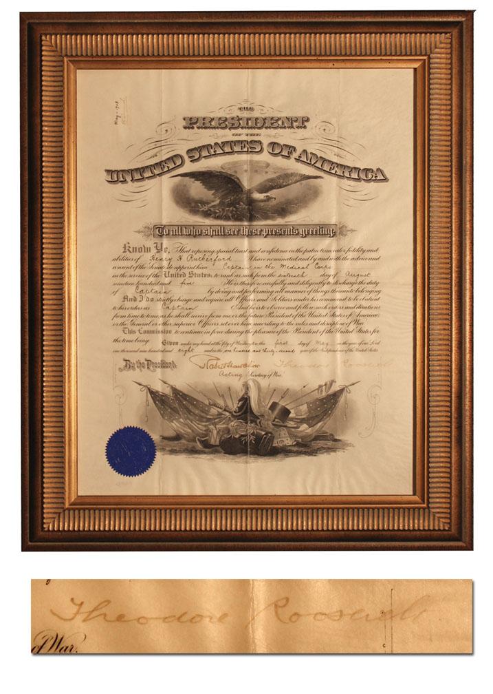 Ornate document signed by Theodore Roosevelt, dated 1 May 1908. Document appoints Henry Rutherford to Captain in the Medical Corps and is signed, ''Theodore Roosevelt''. Countersigned by the Acting Secretary of War, Robert Shaw Oliver. Decorated with elaborate patriotic motifs and a pristine bright blue Naval seal, the framed document measures 20.25'' x 24''. Roosevelt's signature is a tad light as compared with Oliver's, but entirely visible. Near fine.