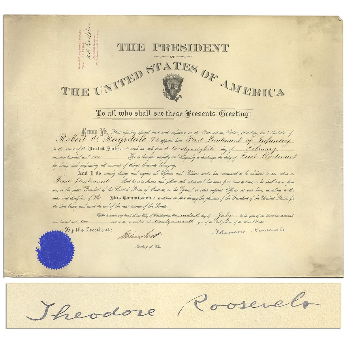 Theodore Roosevelt document signed as President. Partially-printed document appoints one Robert O. Ragsdale to the position of First Lieutenant of Infantry. Dated 17 July 1902, document is countersigned by the Secretary of War, Elihu Root, and features the rubber stamp and signature of Adjutant-General of the US Army. Measures 21'' x 16''. A few tiny tears and creases to edges and chipping to blue seal, else near fine.