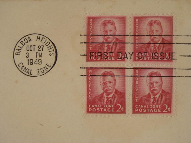 First Day of Issue Theodore Roosevelt Canal Zone 2 Cent Postage Block on envelope. Postmarked Balboa Heights, Oct. 27, 3 pm, 1949, Canal Zone. Reverse has grill and postmark Gould's Oct 29, 10 am, 1949, Fla.