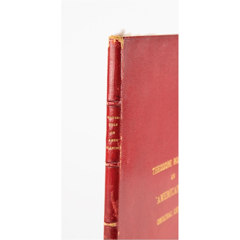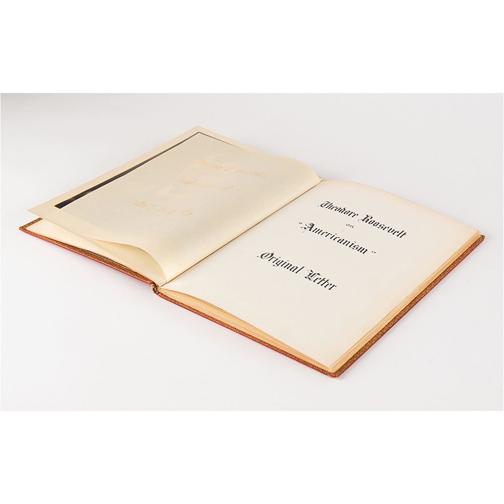 Each page is affixed by its edge to a slightly larger sheet, and bound together within a handsome custom-made red morocco binding; page one is detached from the binding, and several have edge splits which could be easily repaired. Also bound in are two matte-finish portraits, a calligraphic title page, and a complete typed transcript. In fine condition. A remarkable, lengthy exposition of Roosevelt's steadfast commitment to American ideals.